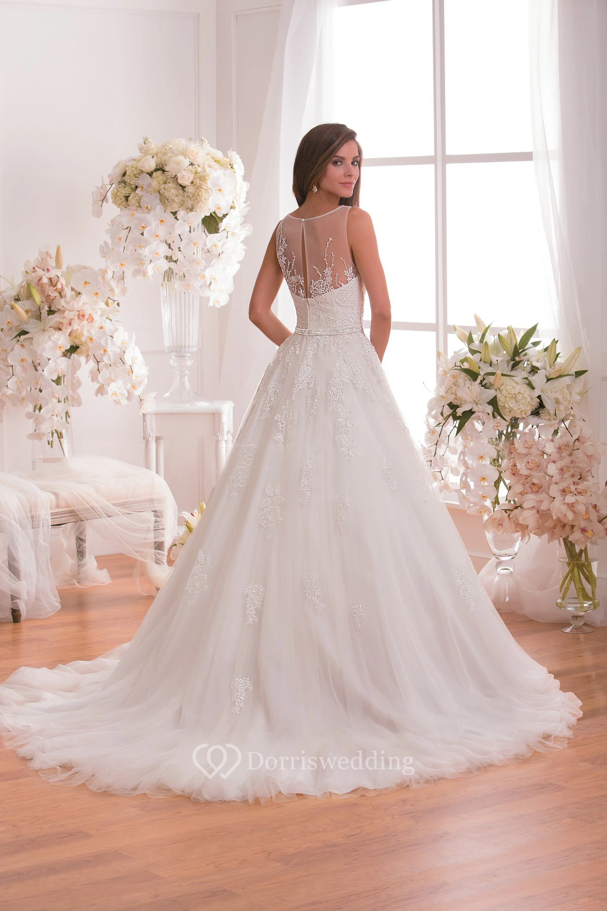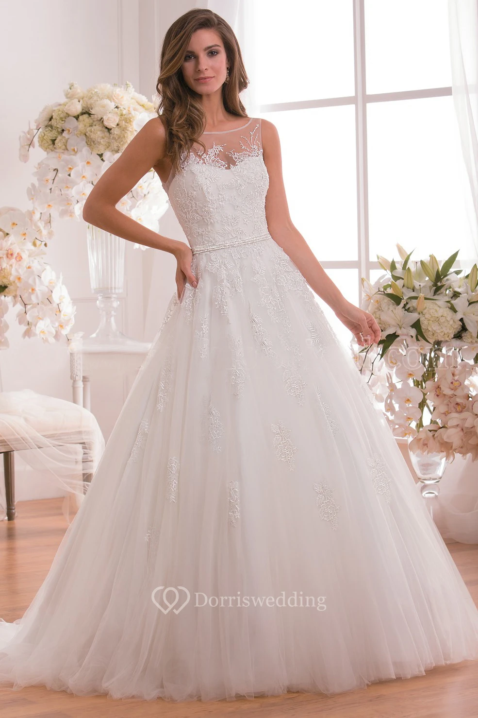 Bateau-Neck A-Line Wedding Dress With Illusion Detail And Floral Appliques