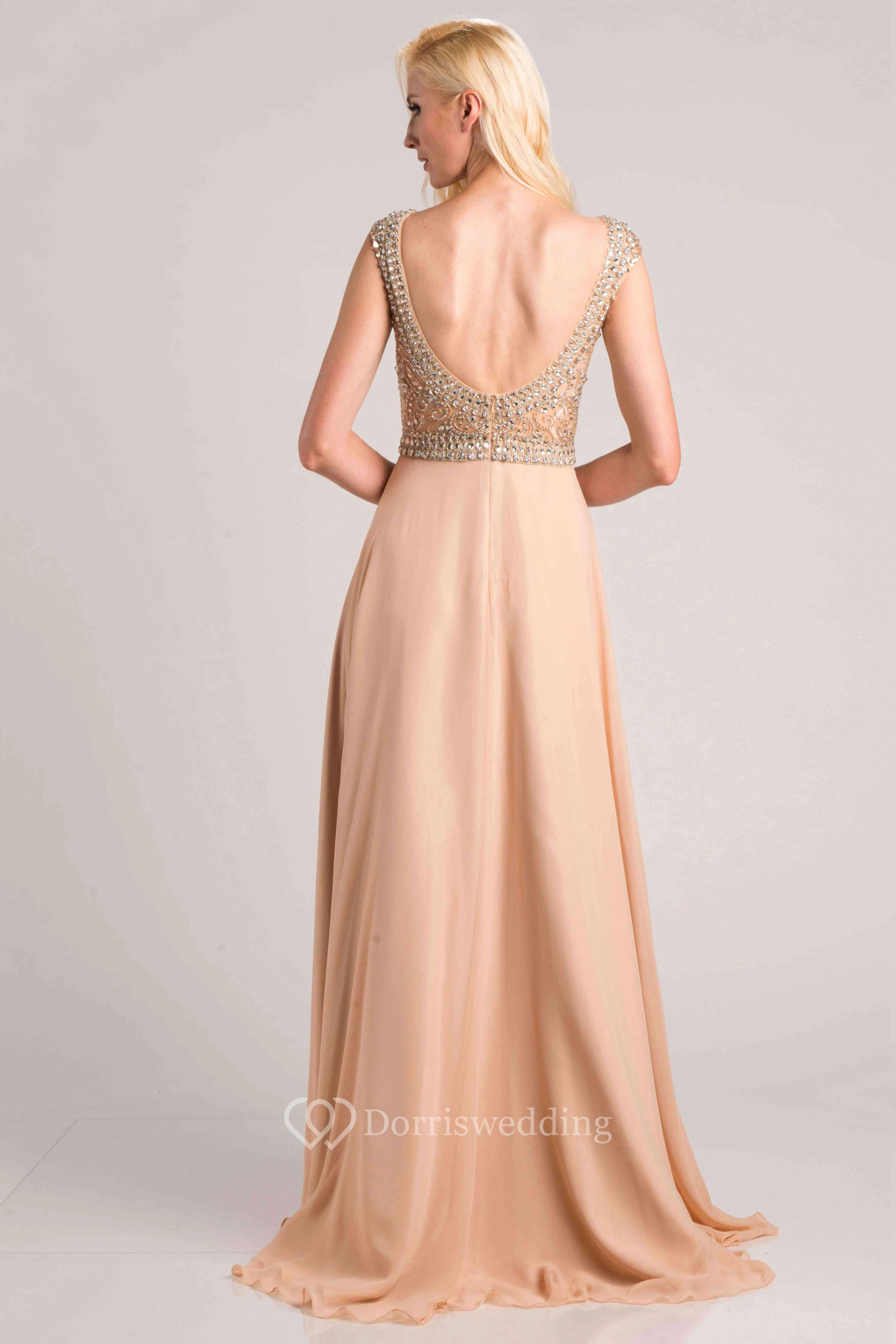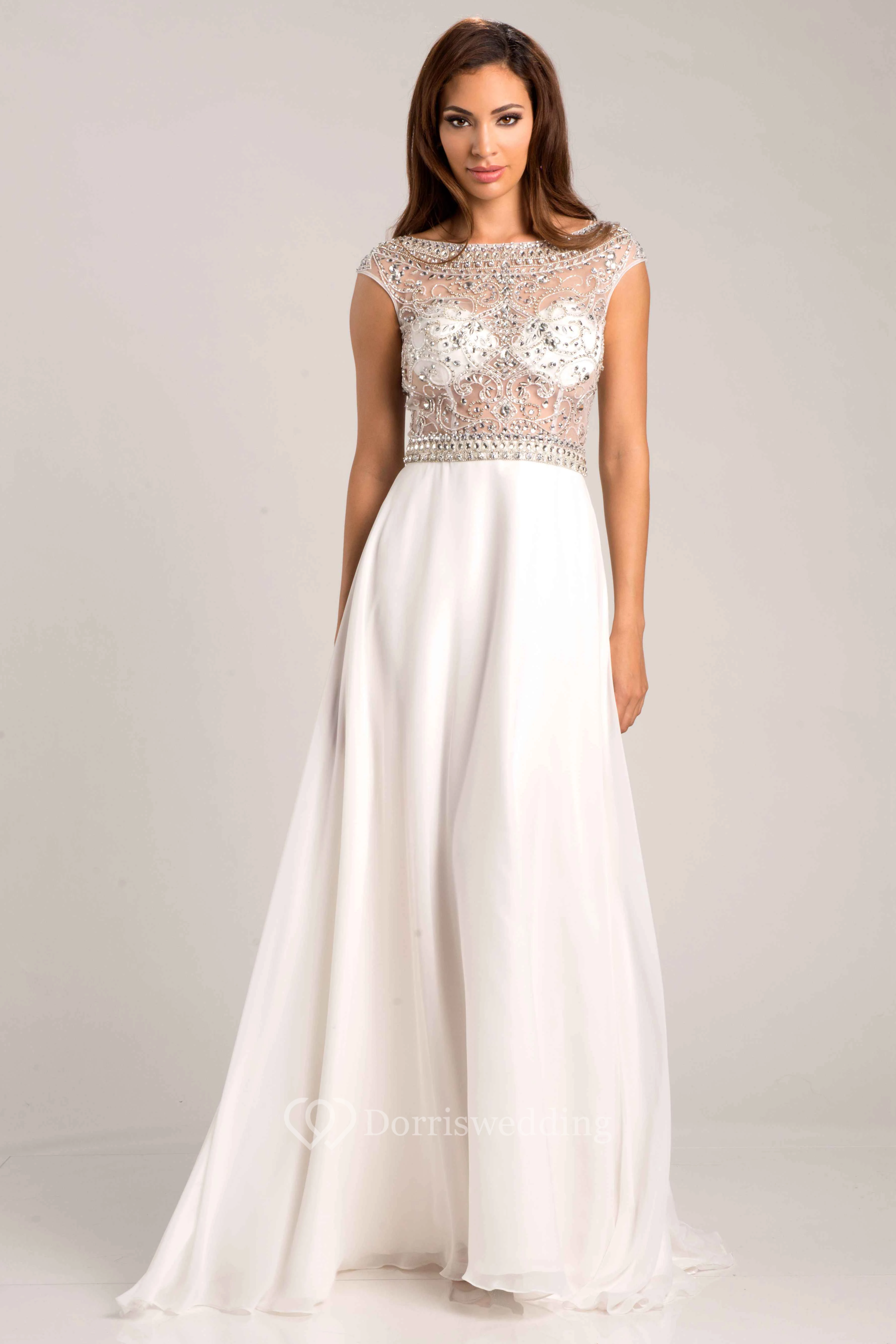 Bateau Neck Cap Sleeve A-Line Chiffon Prom Dress With Jeweled Bodice