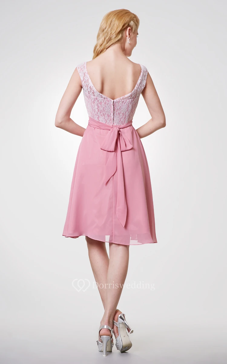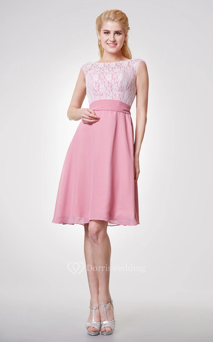 Bateau Neck Cap-sleeved Short Chiffon Dress With Lace Bodice