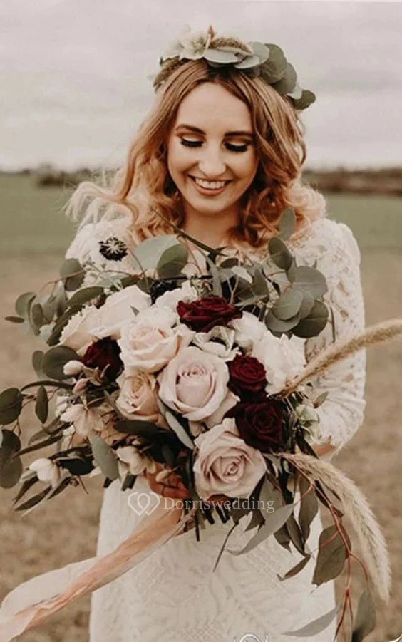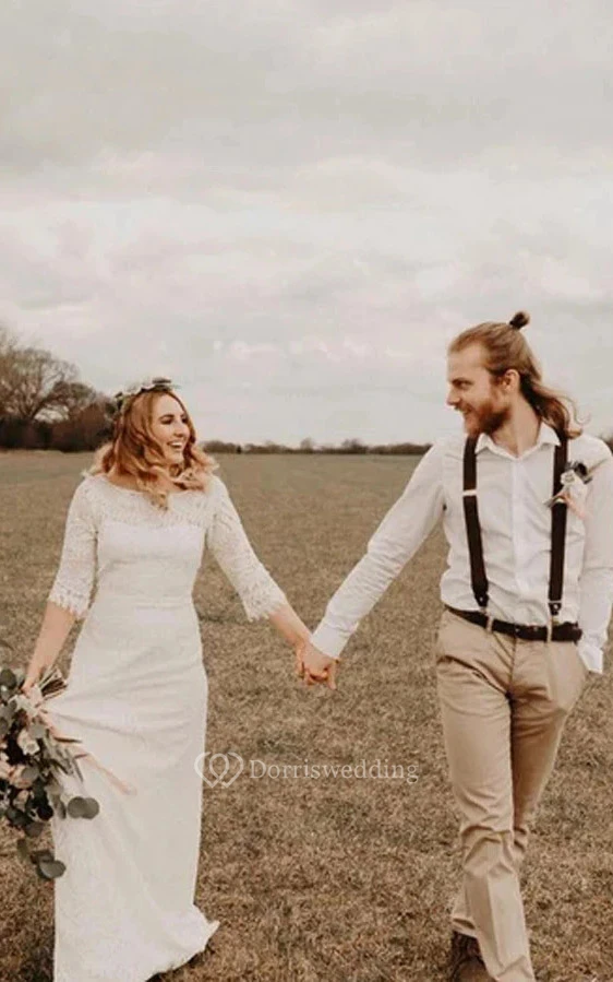 Bateau-neck Lace Half-sleeve Sheath Country Modest Wedding Dress