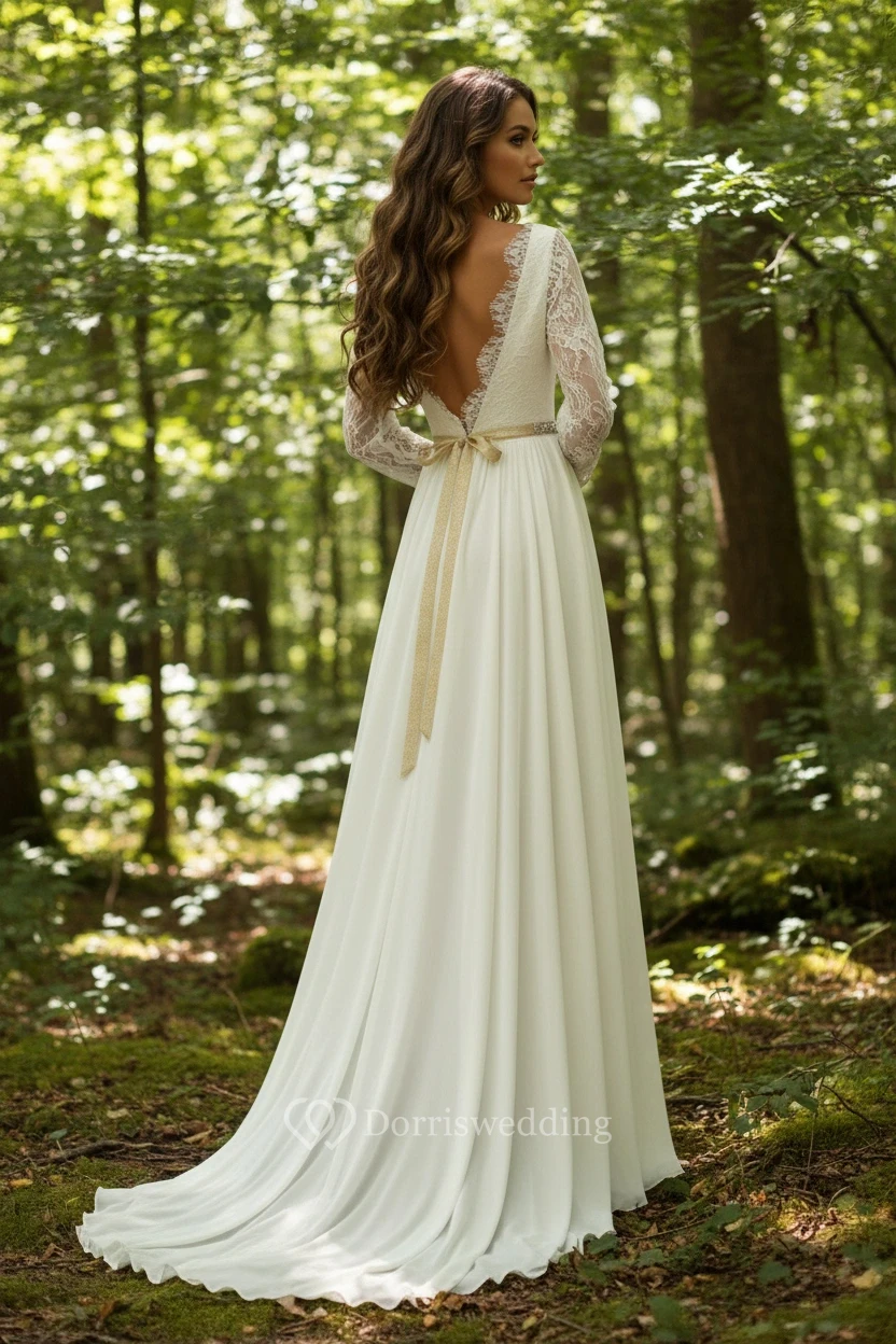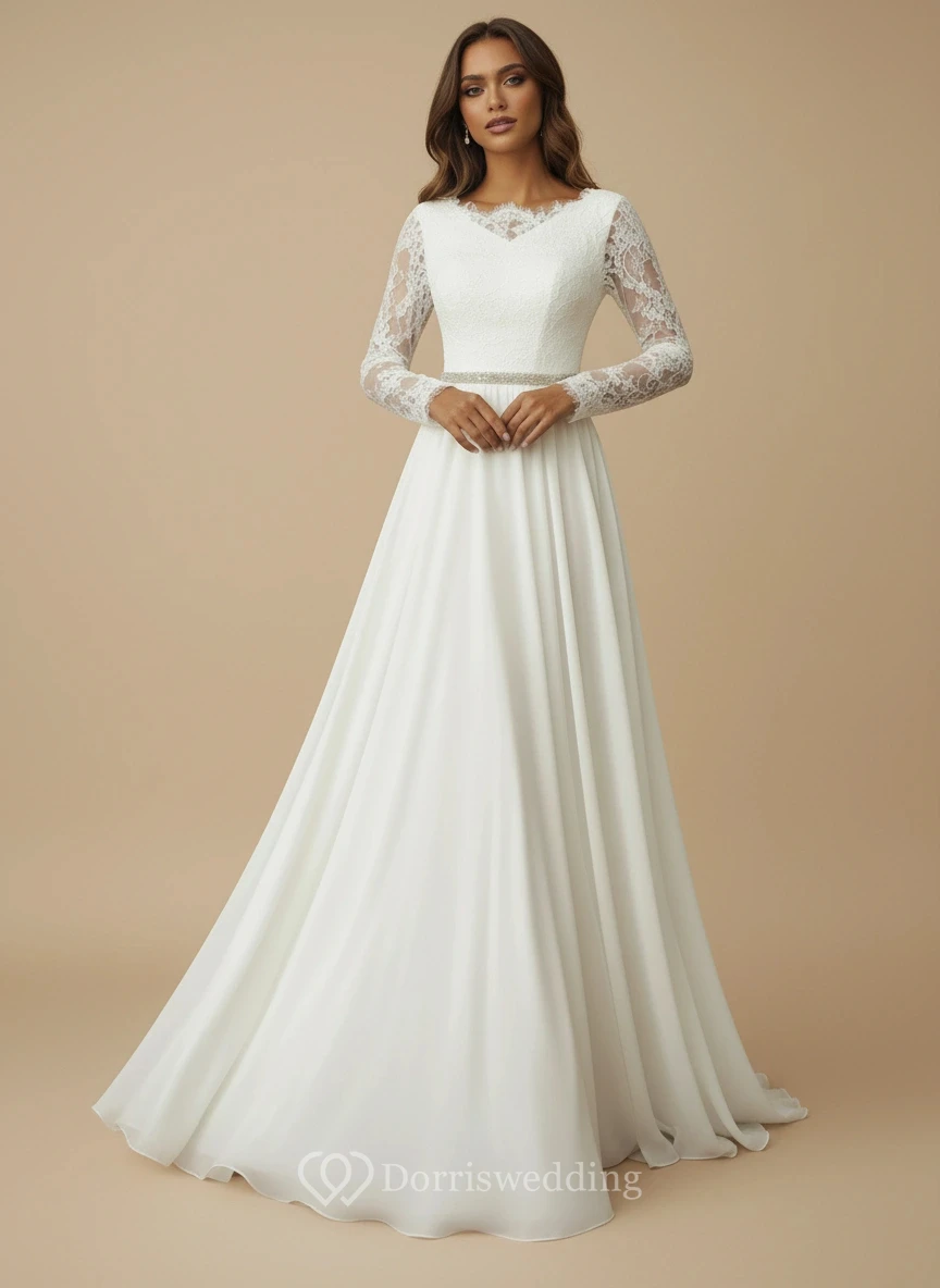 This classic wedding dress combines a V-neck, long lace sleeves, and a satin skirt with a thin belt. Shot against a plain beige background, it focuses on clean lines and sophisticated details. Ideal for a minimalist or formal wedding, it emphasizes elegance and versatility.