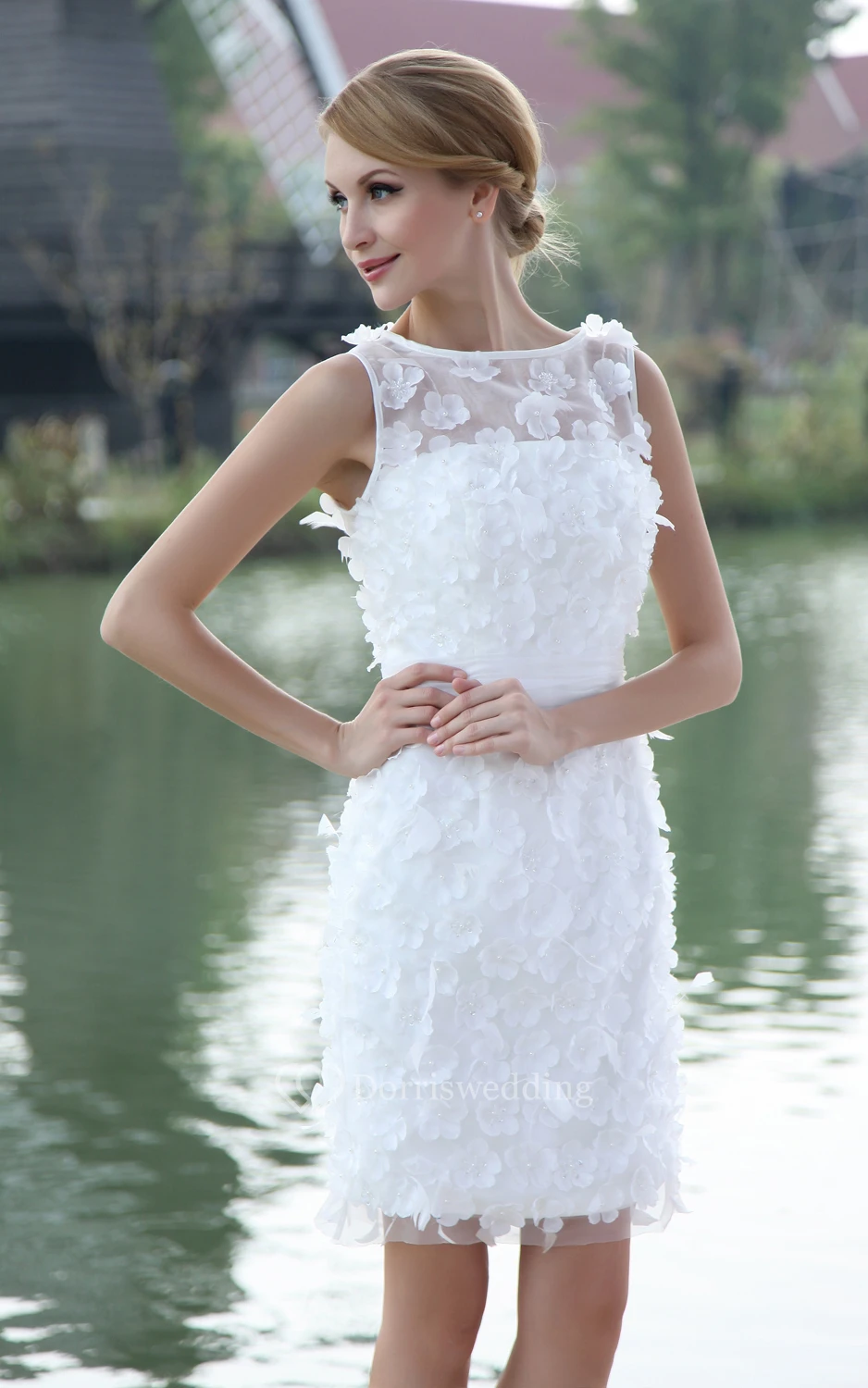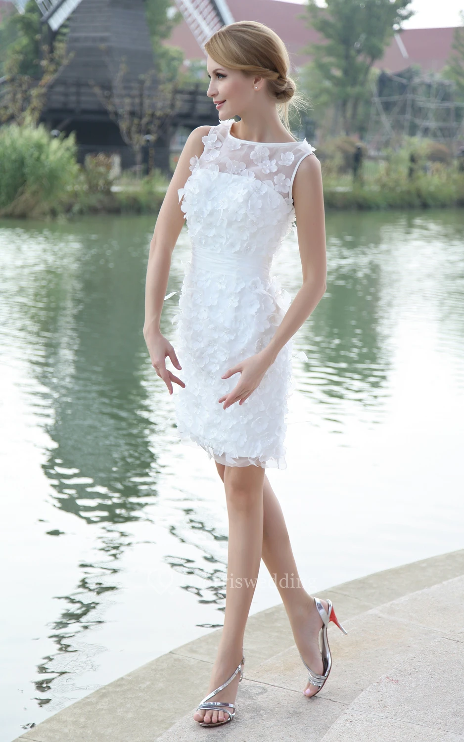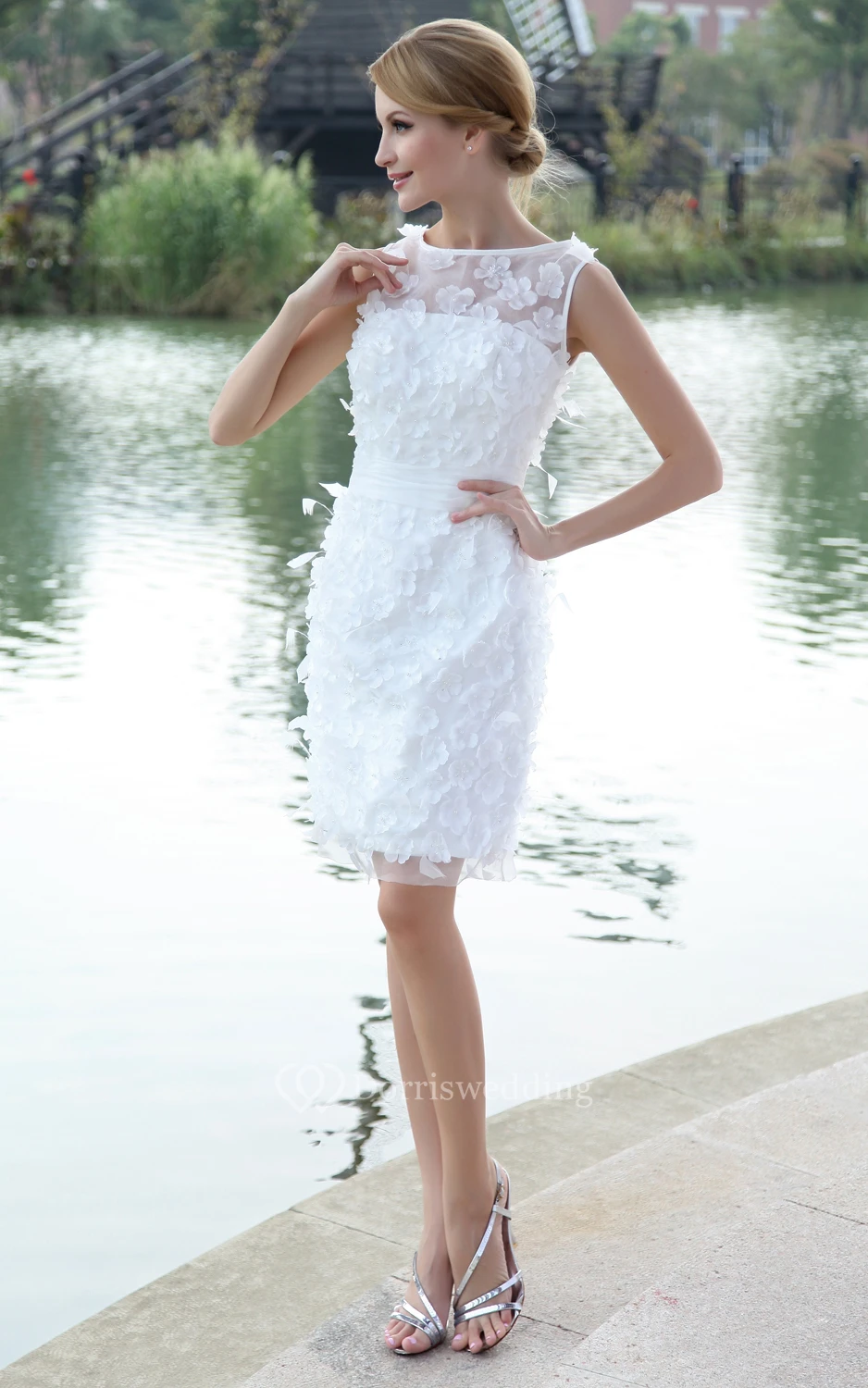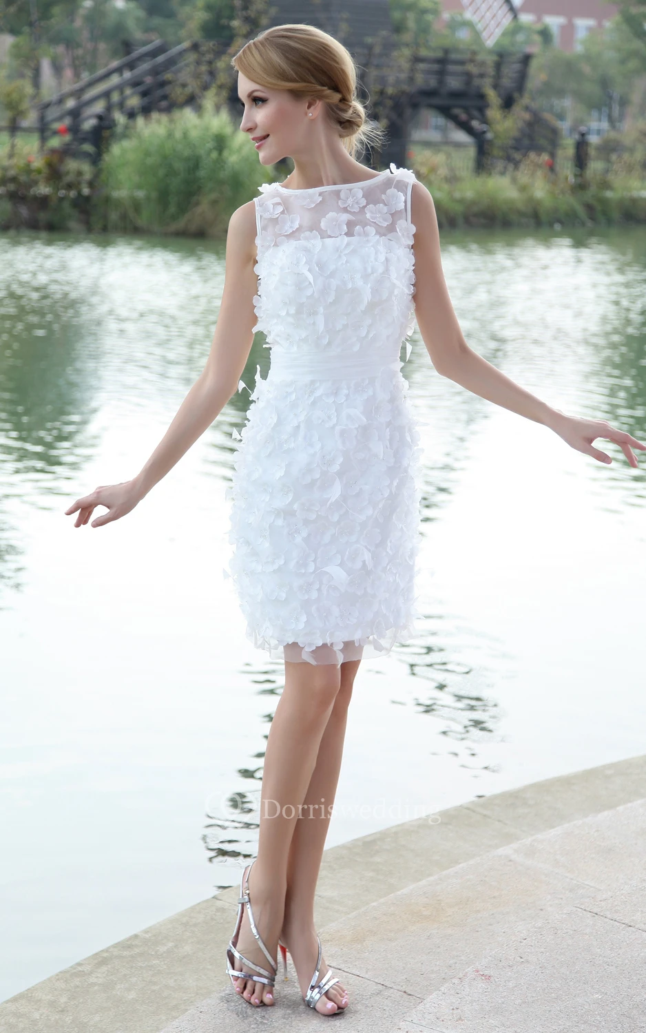 Bateau-Neck Organza Pencil Dress With Flowers