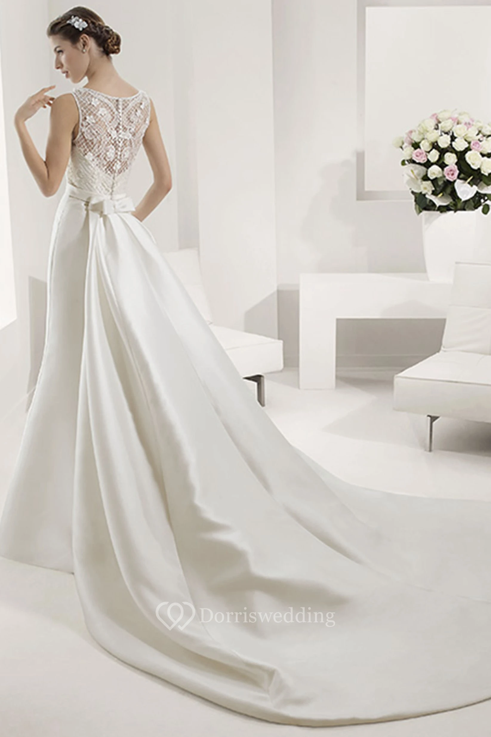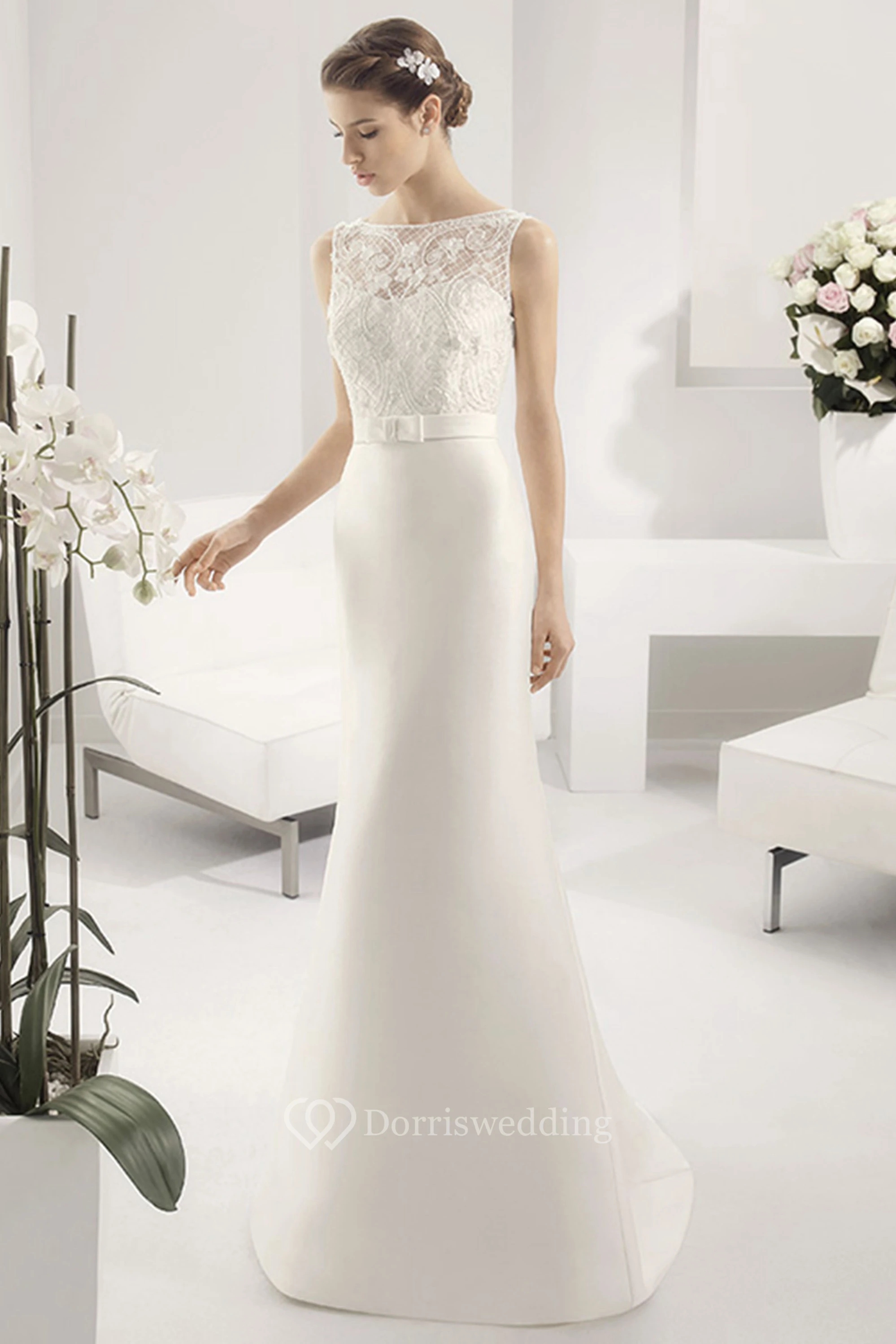 Bateau Neck Sheath Bridal Gown With Appliqued Top And Satin Skirt
