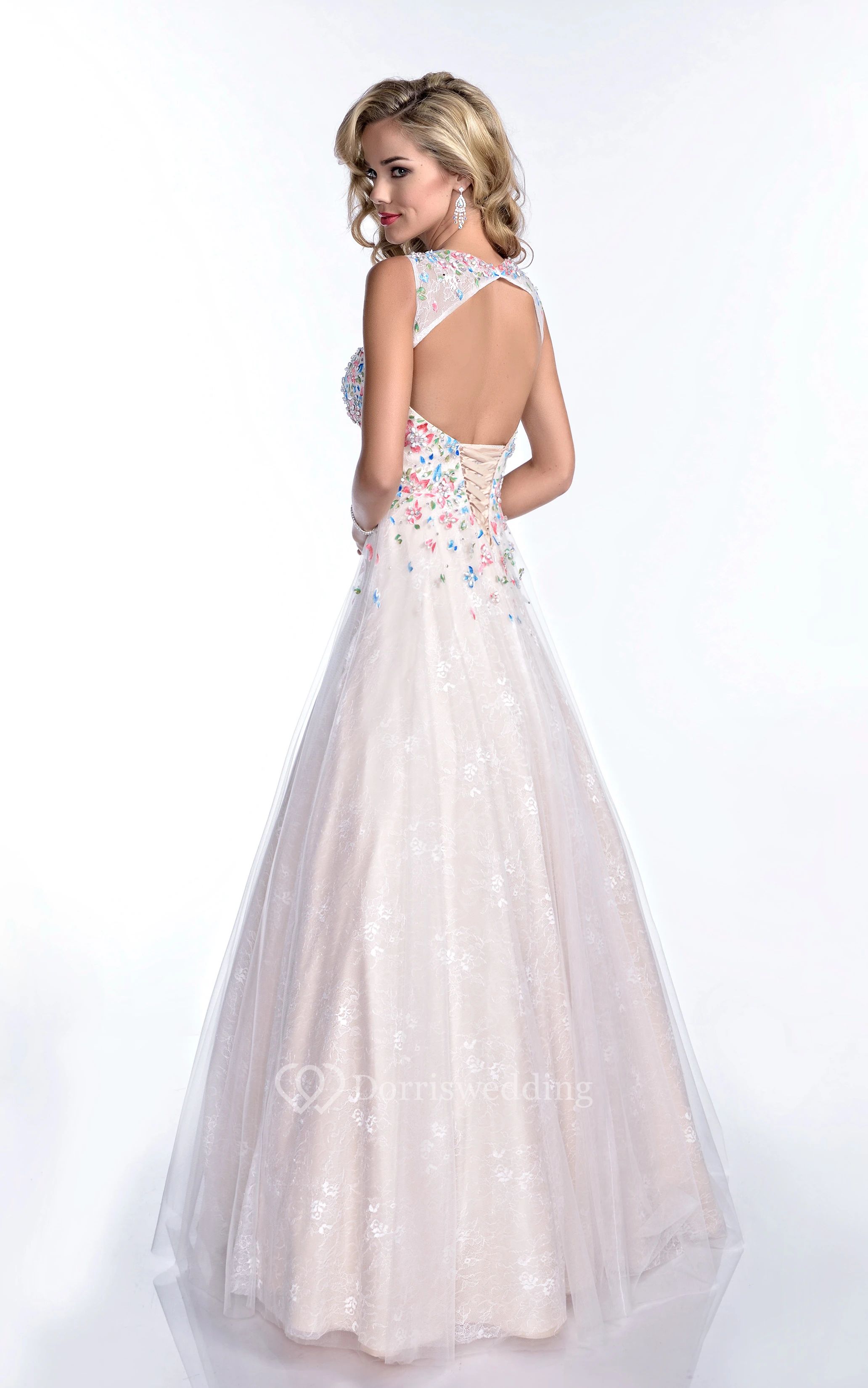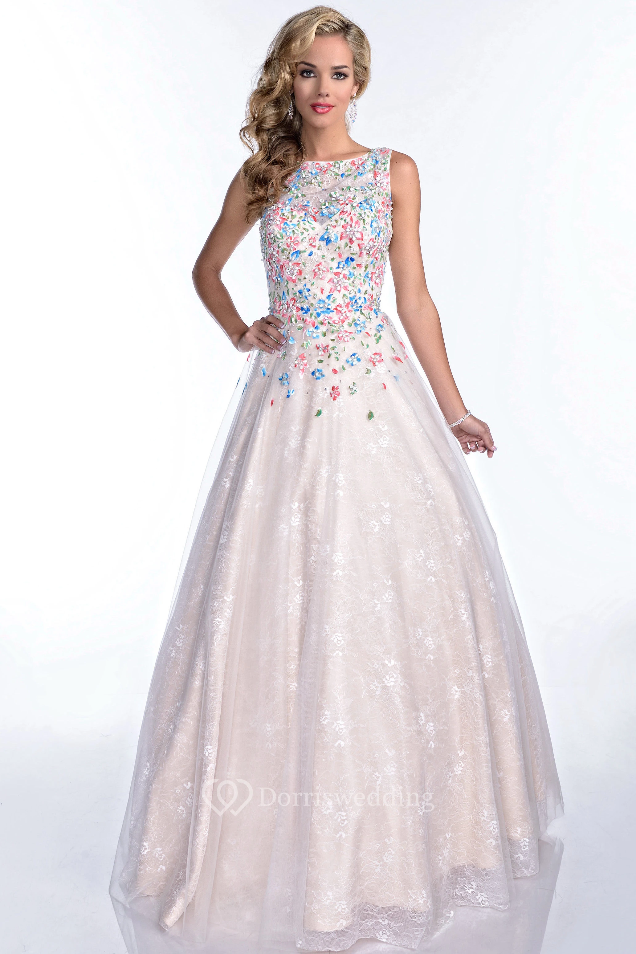 Bateau Neck Sleeveless A-Line Lace Prom Dress With Bling Rhinestone Bodice