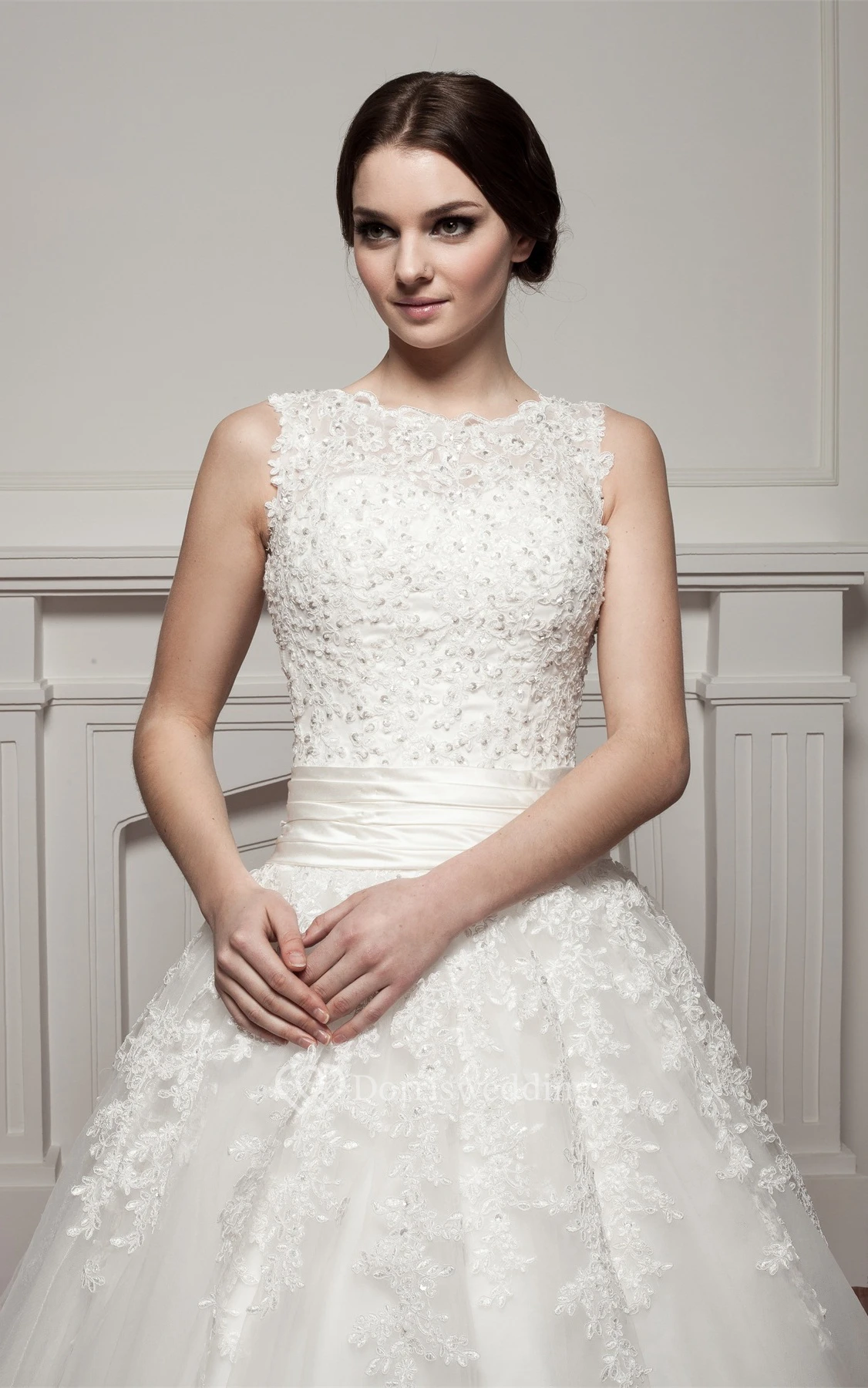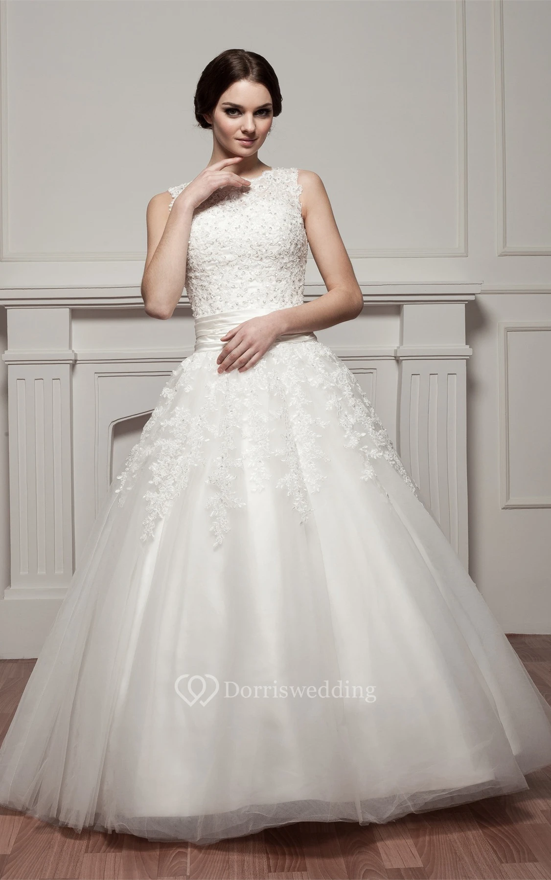 Bateau-Neck Sleeveless Tulle Overlay and Ball-Gown With Appliques