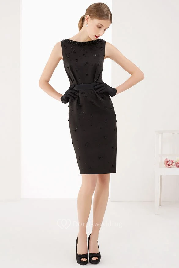 Bateau Sheath Knee Length Satin Prom Dress With Sash And Crystals