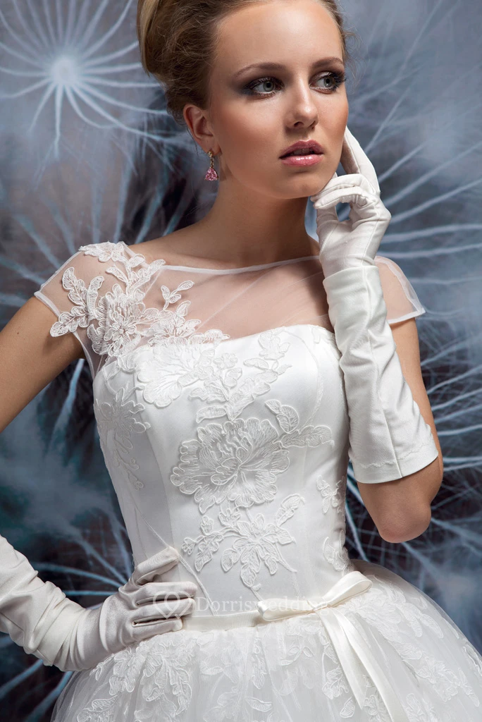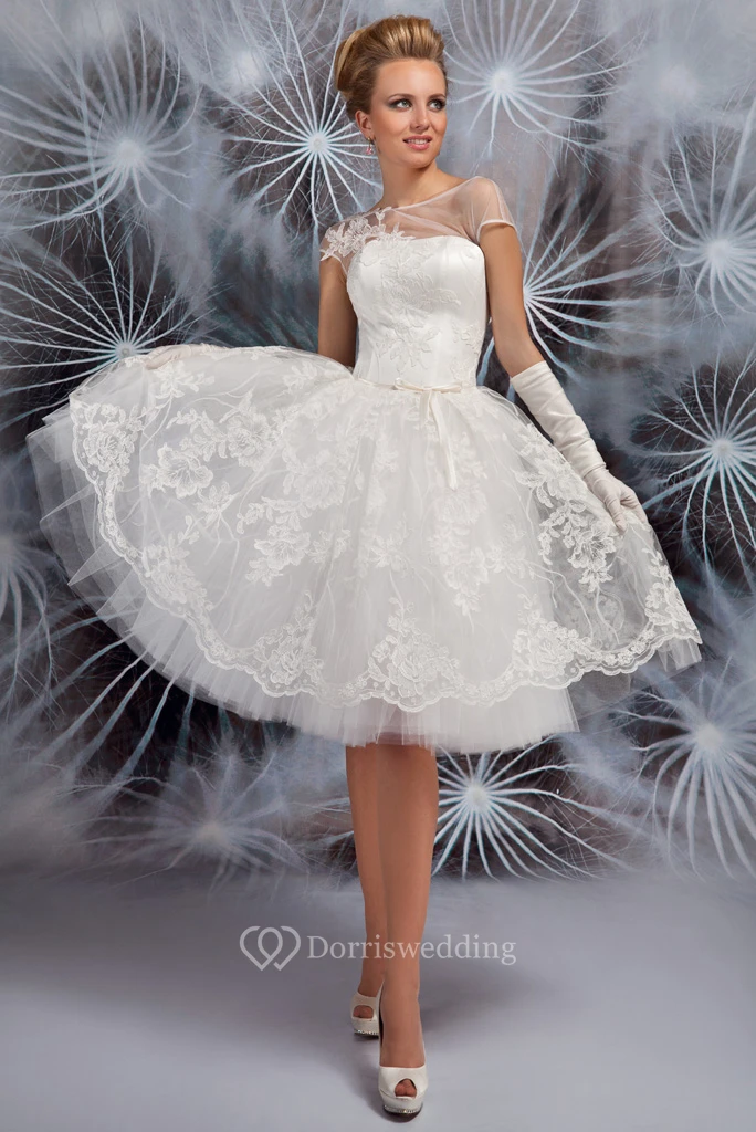 Bateau Short Appliqued Cap-Sleeve Tulle Wedding Dress