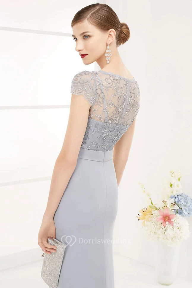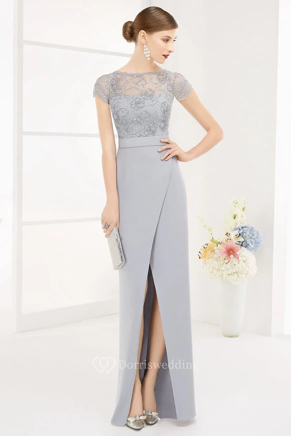 Bateau Short Sleeve Sequin Lace Top Long Prom Dress With Front Split