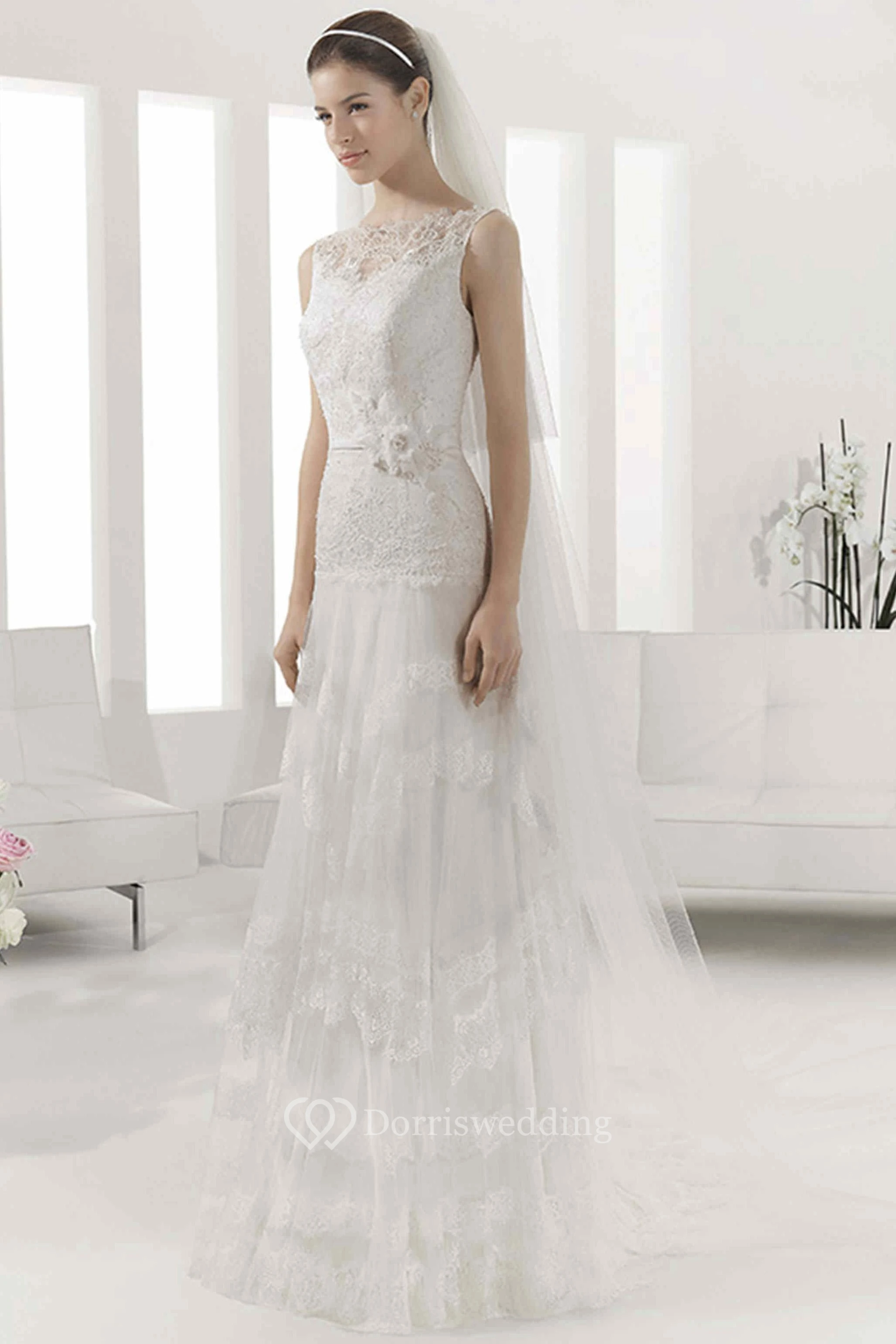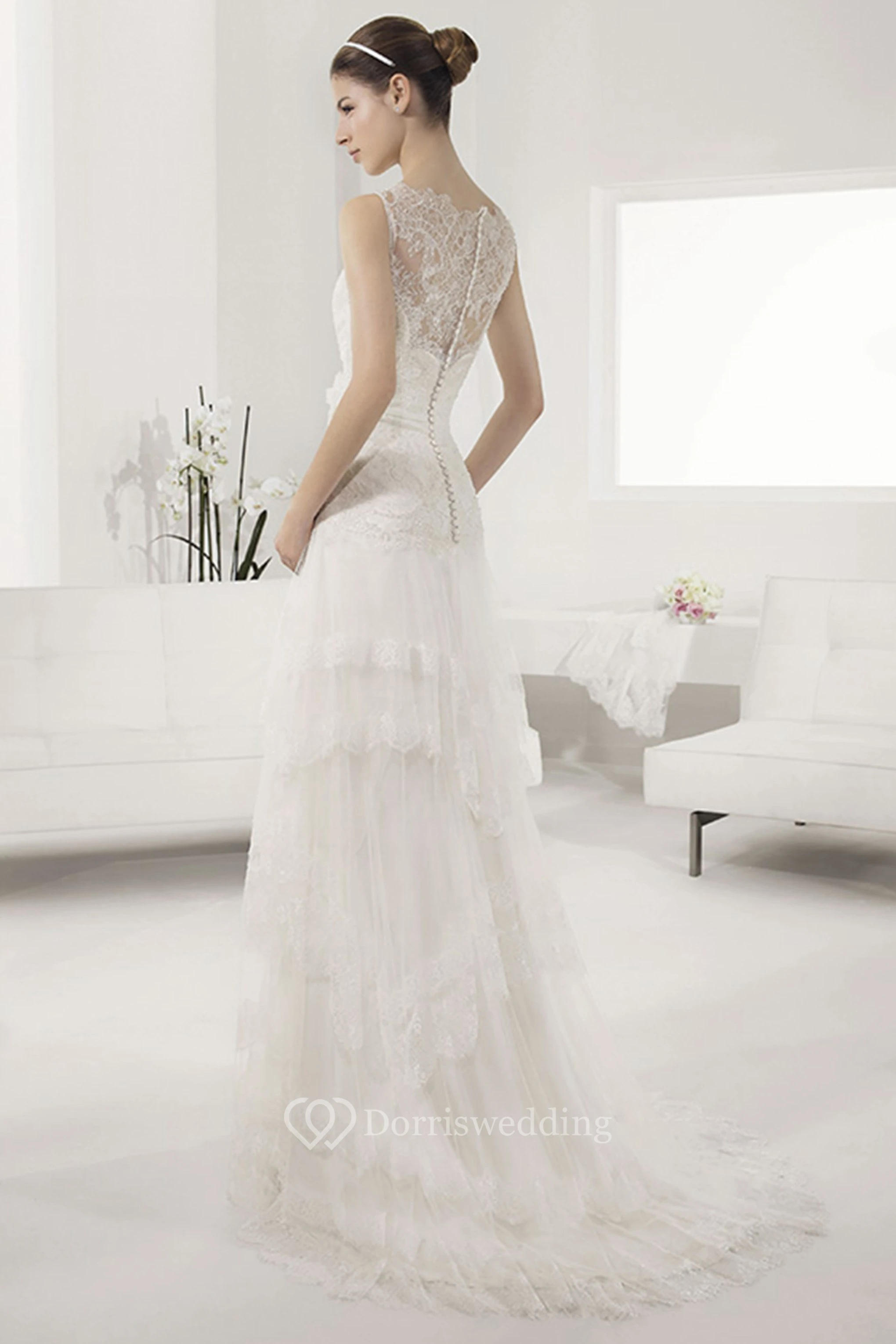 Bateau Sleeveless A-Line Tulle Gown With Lace Bodice And Layered Skirt