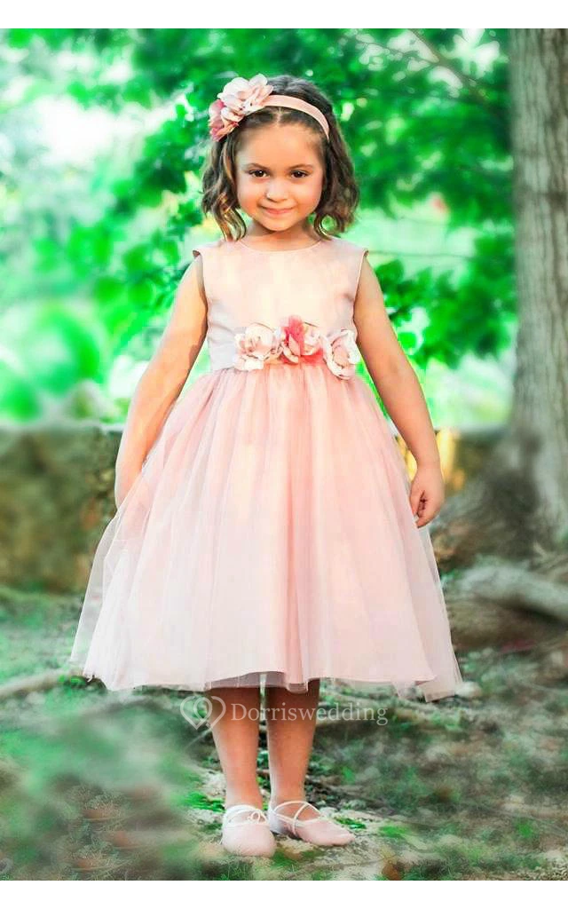 Bateau Sleeveless Pleated A-line Tulle Tea Length Dress With Flower Sash