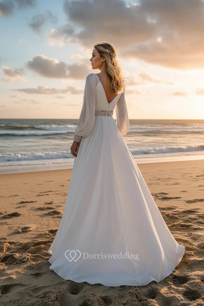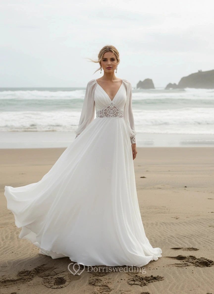 Beach Chiffon Empire V-Neck Sheer Sleeve Wedding Dress with Lace Waist