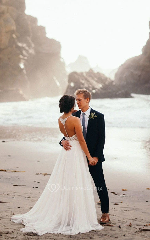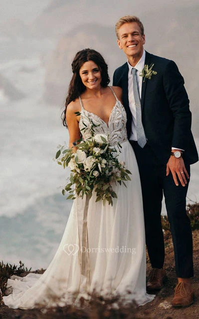 Beach Spaghetti Empire Pleated Chiffon Boho Wedding Dress with Lace Top