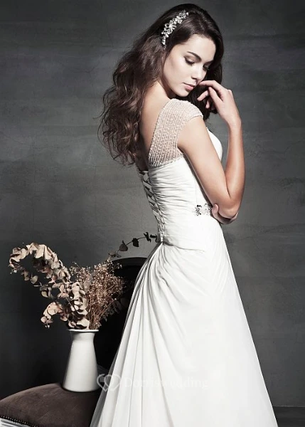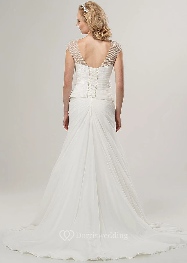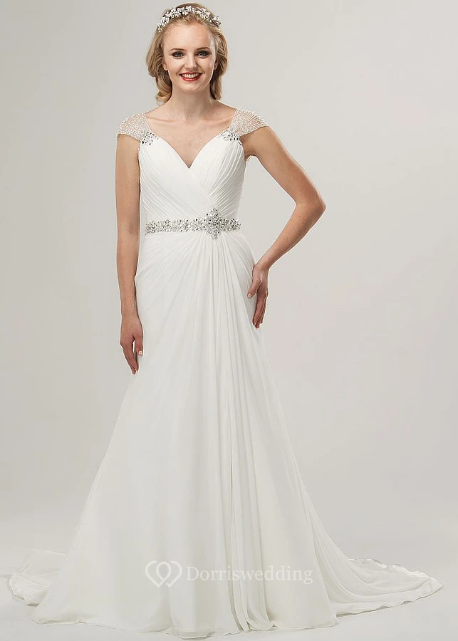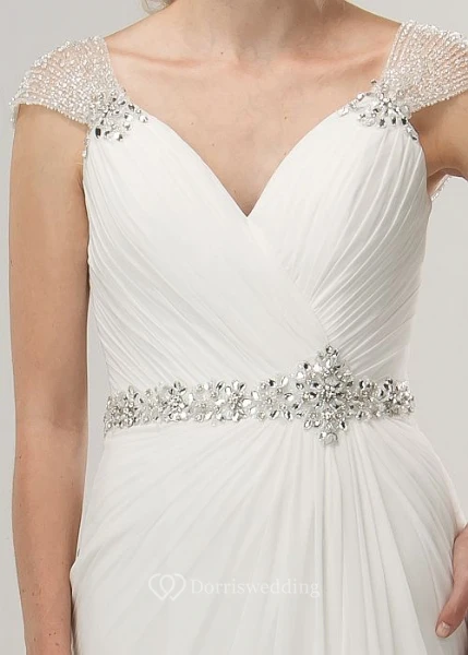 Beaded Cap-Sleeve V-Neck Chiffon Wedding Dress With Waist Jewellery And Criss Cross