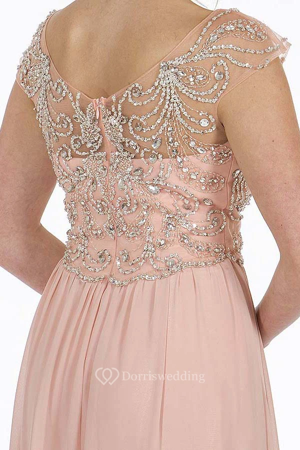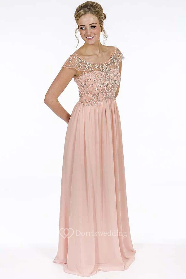 Beaded Floor-Length Cap-Sleeve Scoop-Neck Chiffon Prom Dress