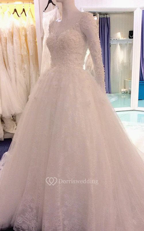 Beaded Lace A-Line Long Sleeve Dress With Illusion Back