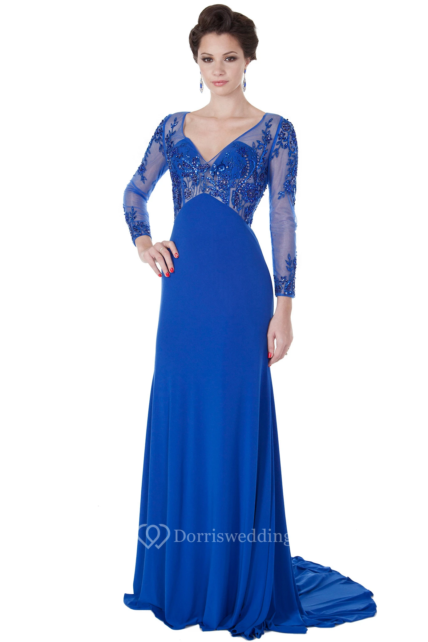 Beaded Long-Sleeve V-Neck Maxi Chiffon Evening Dress With Appliques