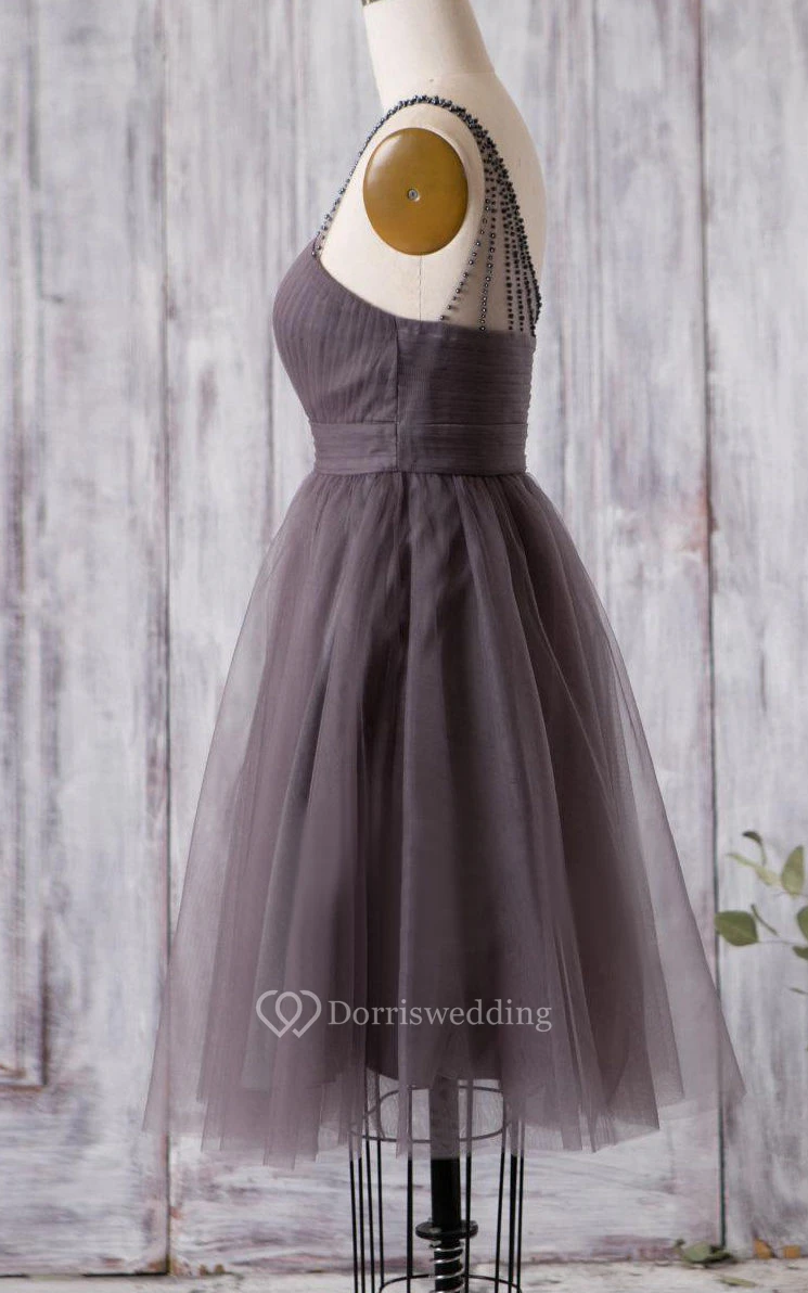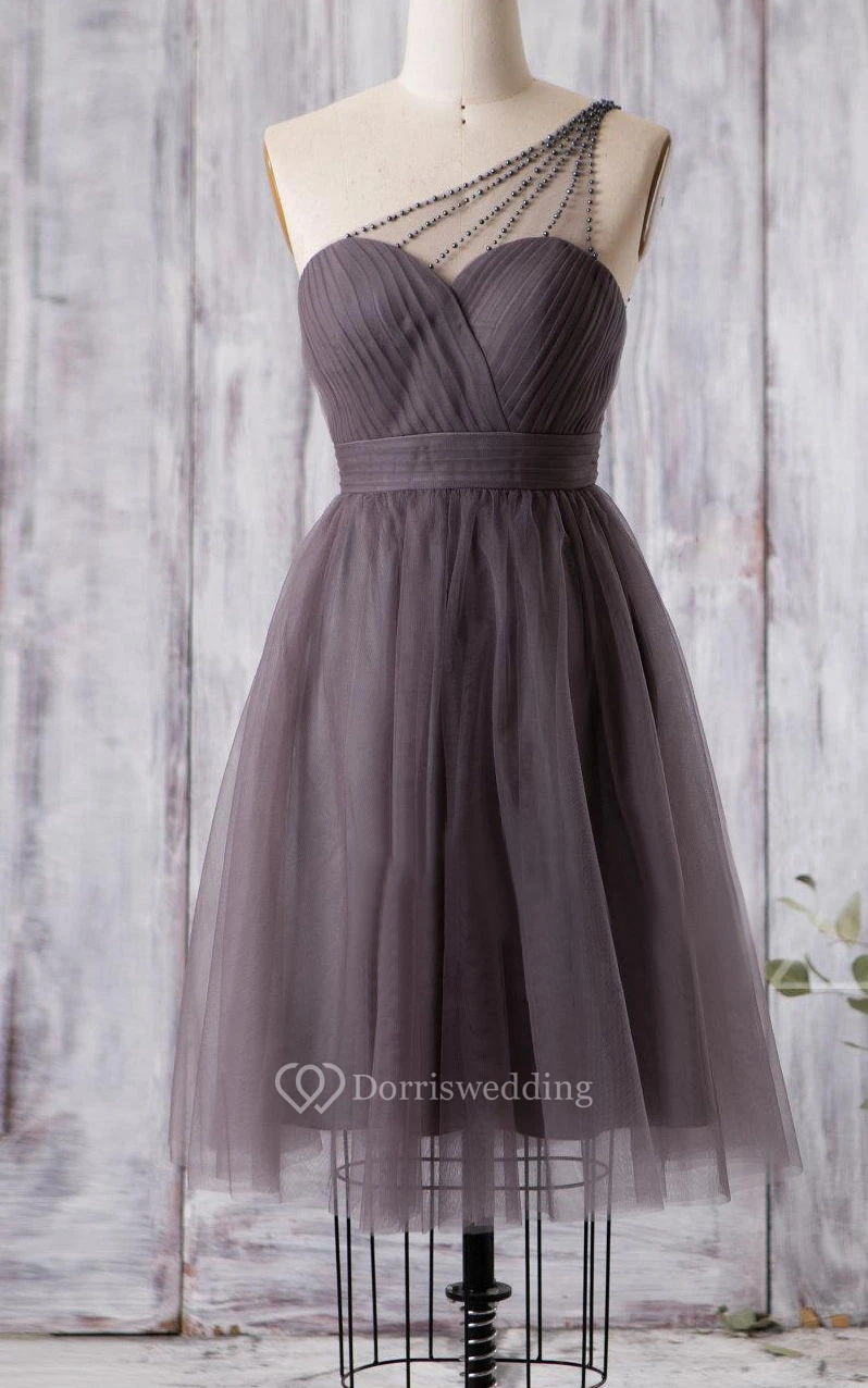 Beaded Single Strap Sweetheart A-line Pleated Tulle Knee Length Dress