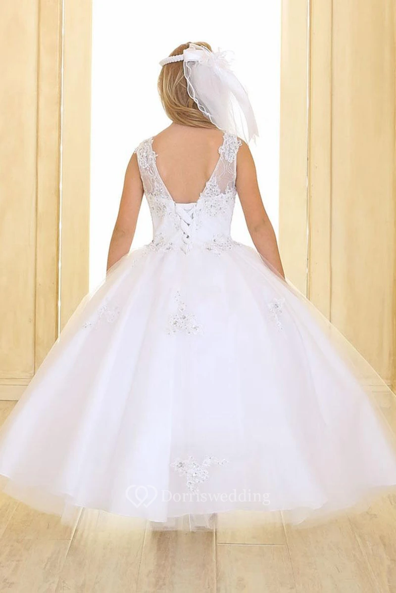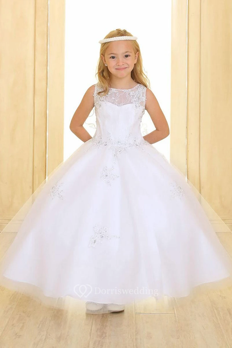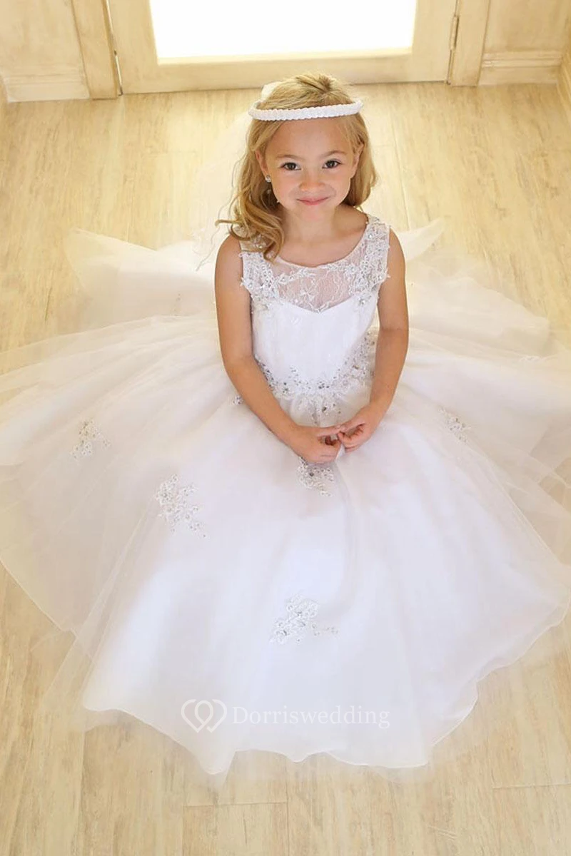 Beaded Tiered Tulle&Lace Flower Girl Dress With Illusion