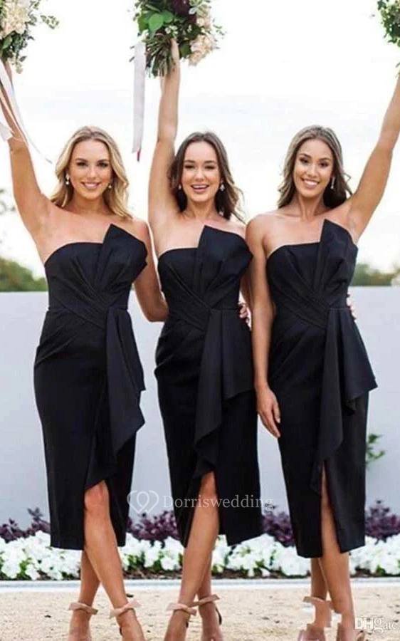 Black Ruched Pencil Tea-length Bowed Bridesmaid Dress