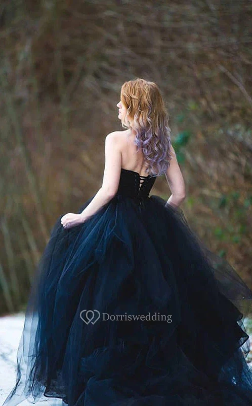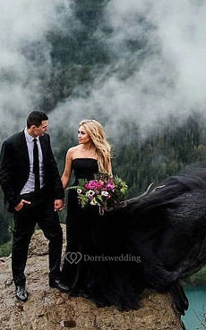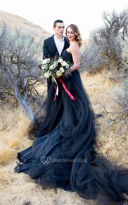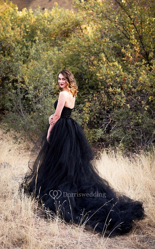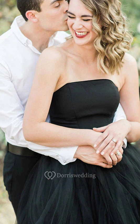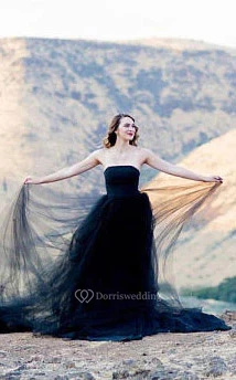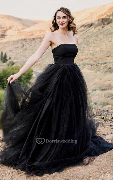 Black Strapless Gothic Tulle Simple Dress with Court Train