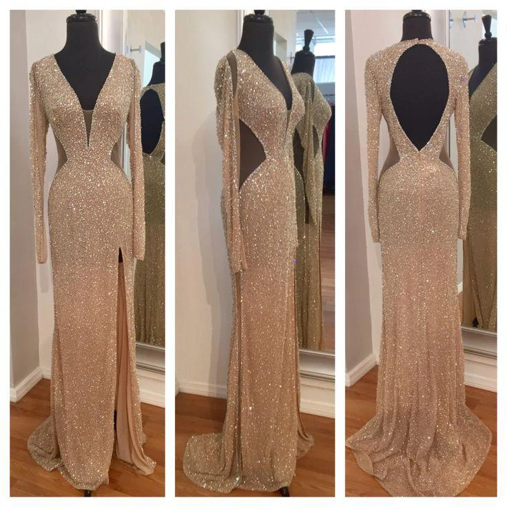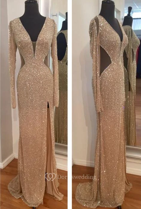 Bling Bling Long Sleeve Sequins Evening Dress Front Split Party Gowns