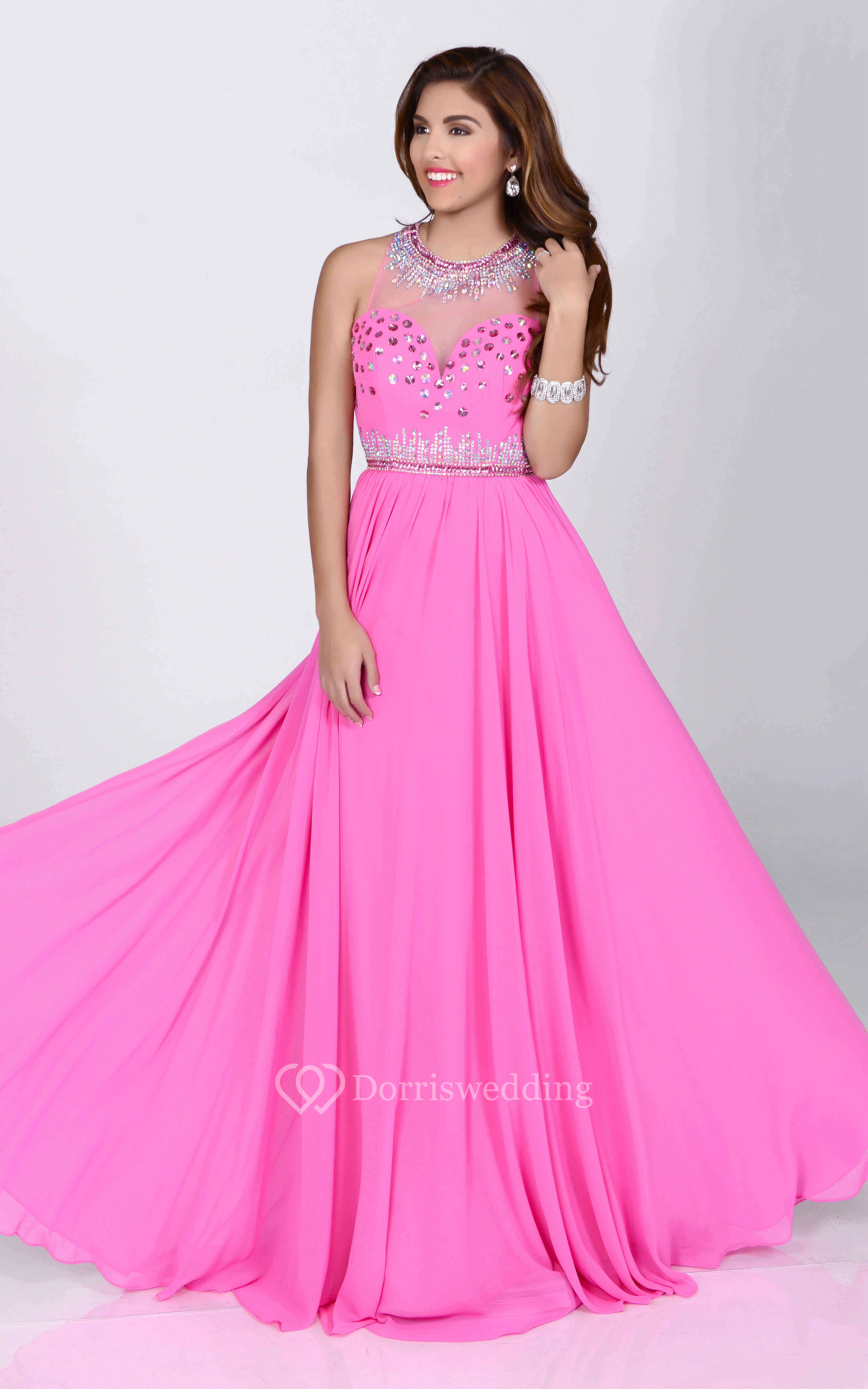 Bling Rhinestone Neck Sequined Bust A-Line Sleeveless Chiffon Prom Dress