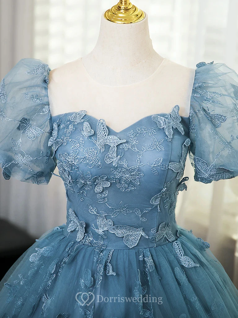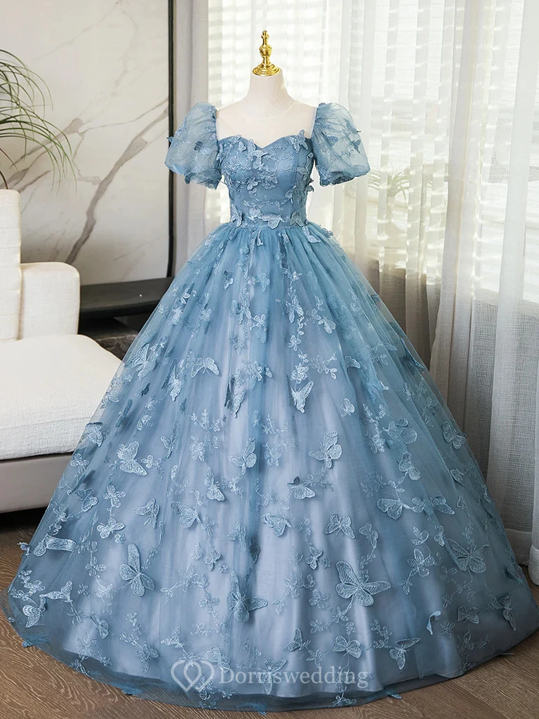This dreamy blue ball gown features a fitted bodice with butterfly appliqués, puff sleeves, and a voluminous multi-layer tulle skirt in a princess style. The delicate butterfly decorations add a romantic and whimsical touch, perfect for proms, fairy-tale weddings, or formal events. The lightweight tulle fabric provides both structure and movement, creating an elegant and magical appearance for special occasions.