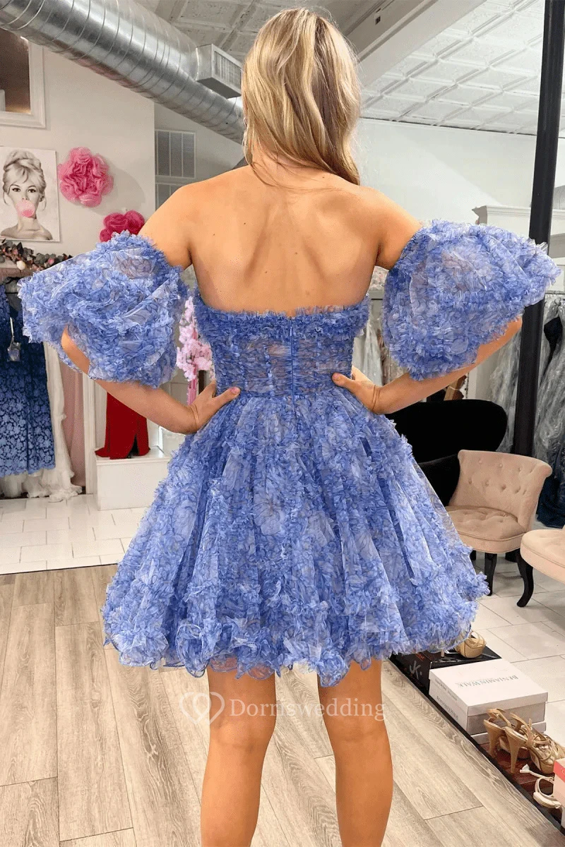 This bright blue off-the-shoulder dress features cascading ruffles and a voluminous skirt, creating a playful and elegant look. Perfect for parties, proms, or special events, it offers a comfortable fit with its lightweight fabric. The design is ideal for making a statement at evening gatherings, combining style and movement.