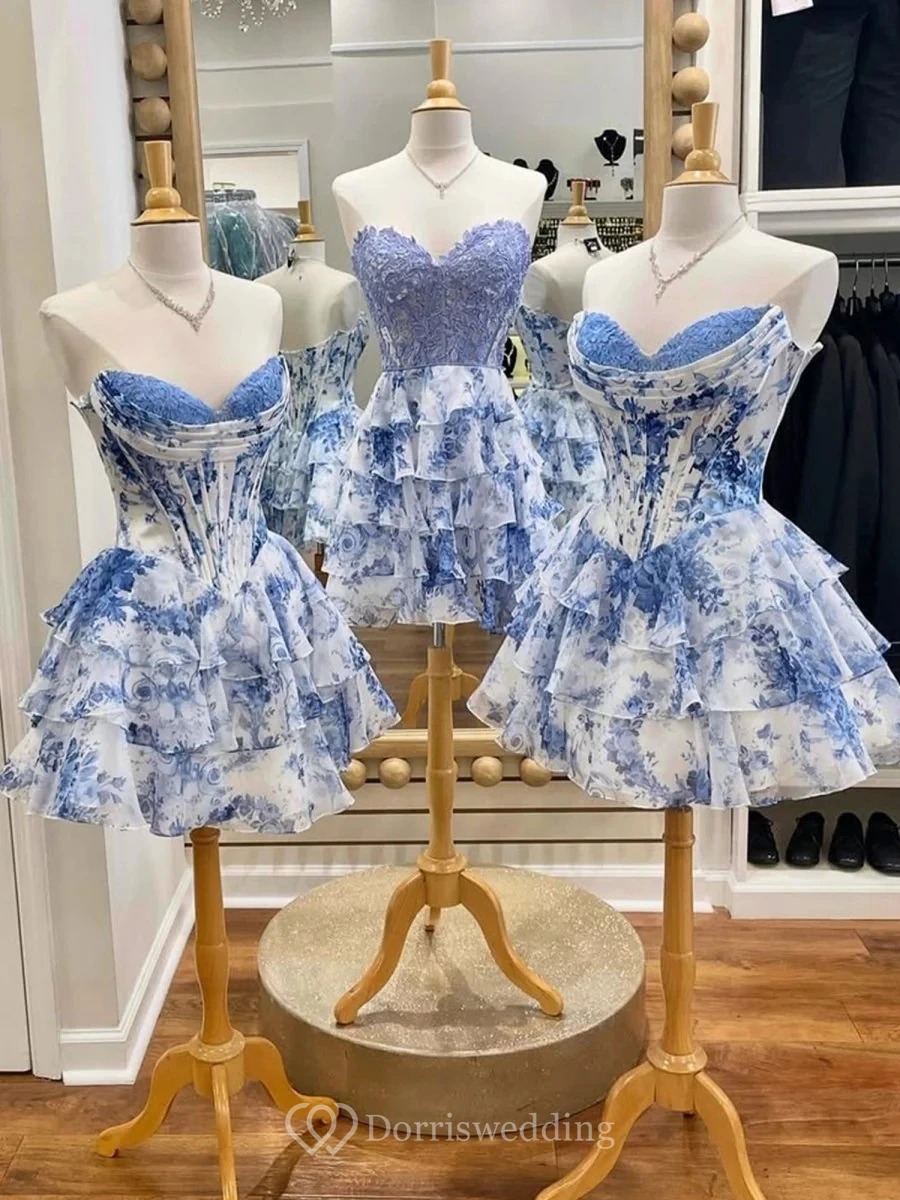 This fashionable blue and white print dress features a one-shoulder neckline with a fitted bodice and a fluffy short skirt adorned with layered ruffles. The unique design combines elegance and playfulness, making it perfect for parties or special occasions. Made from lightweight chiffon-like fabric, it ensures comfort and movement. Ideal for proms, cocktails, or evening events, it stands out with its精致印花和荷叶边细节.