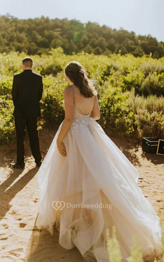 Blush Spaghetti Empire Plus Size Tulle Applique Ball Gown Beach Wedding Dress