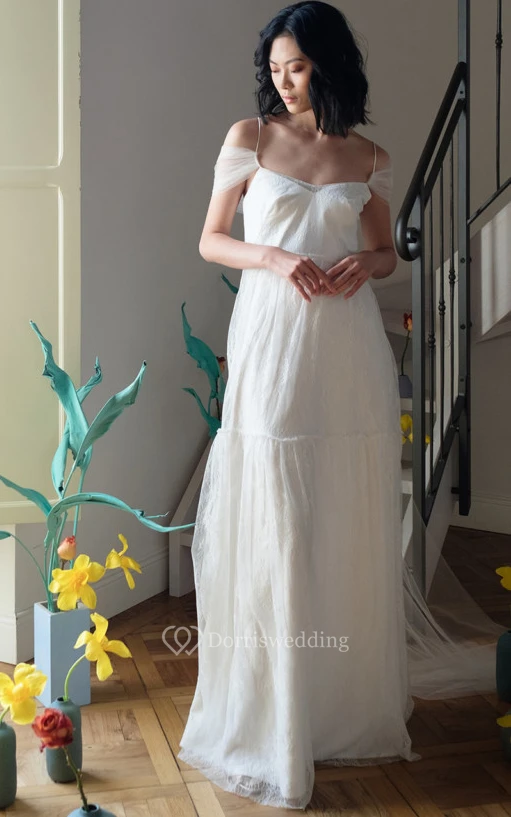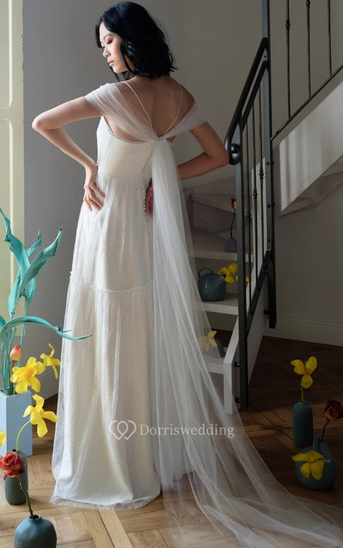 Bohemian Lace Spaghetti Short Sleeve Ruching Wedding Dress With Button