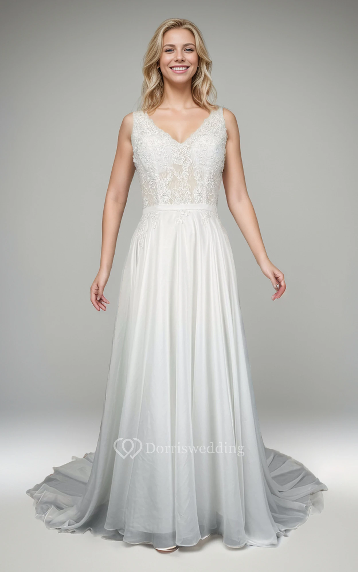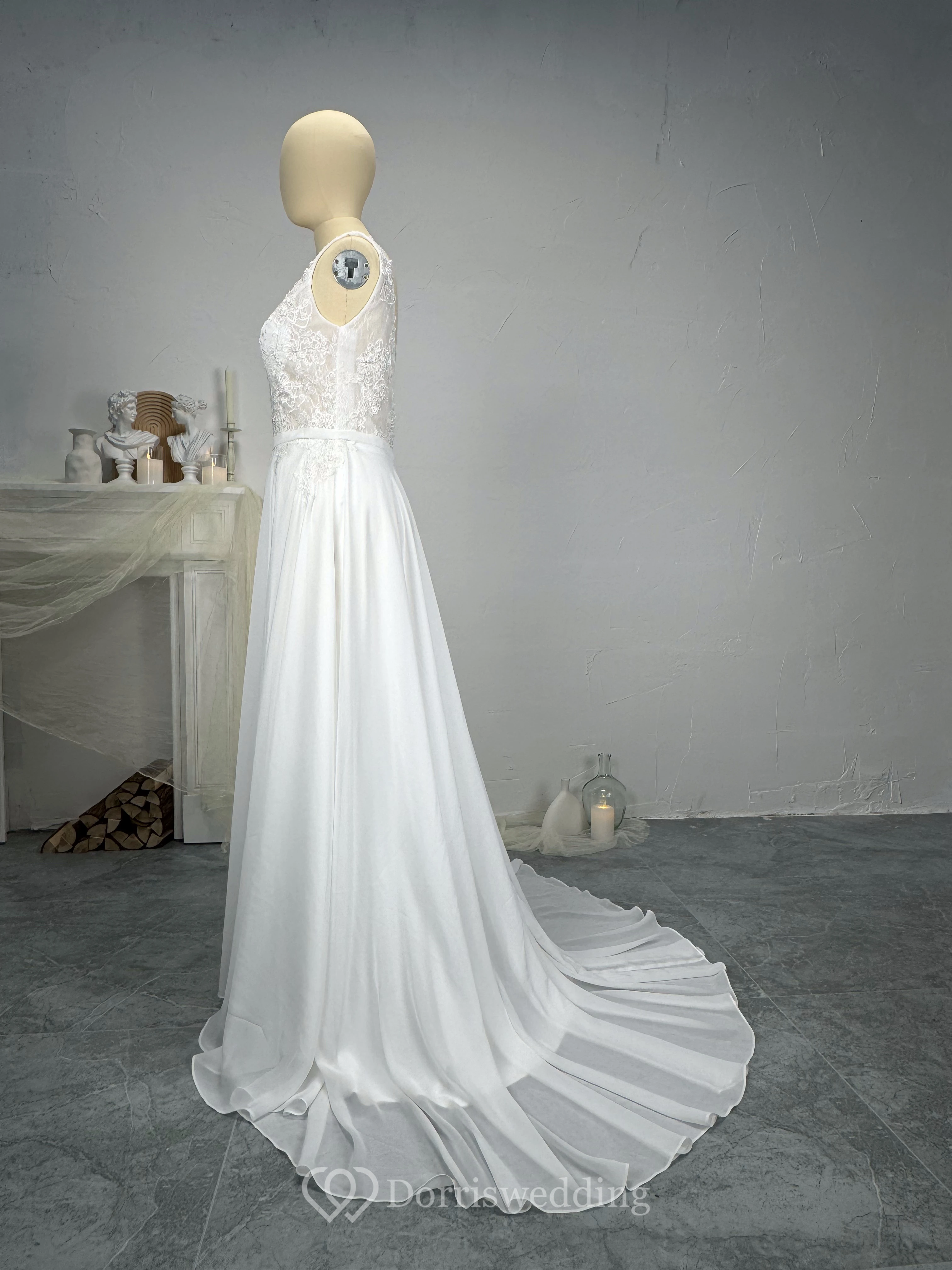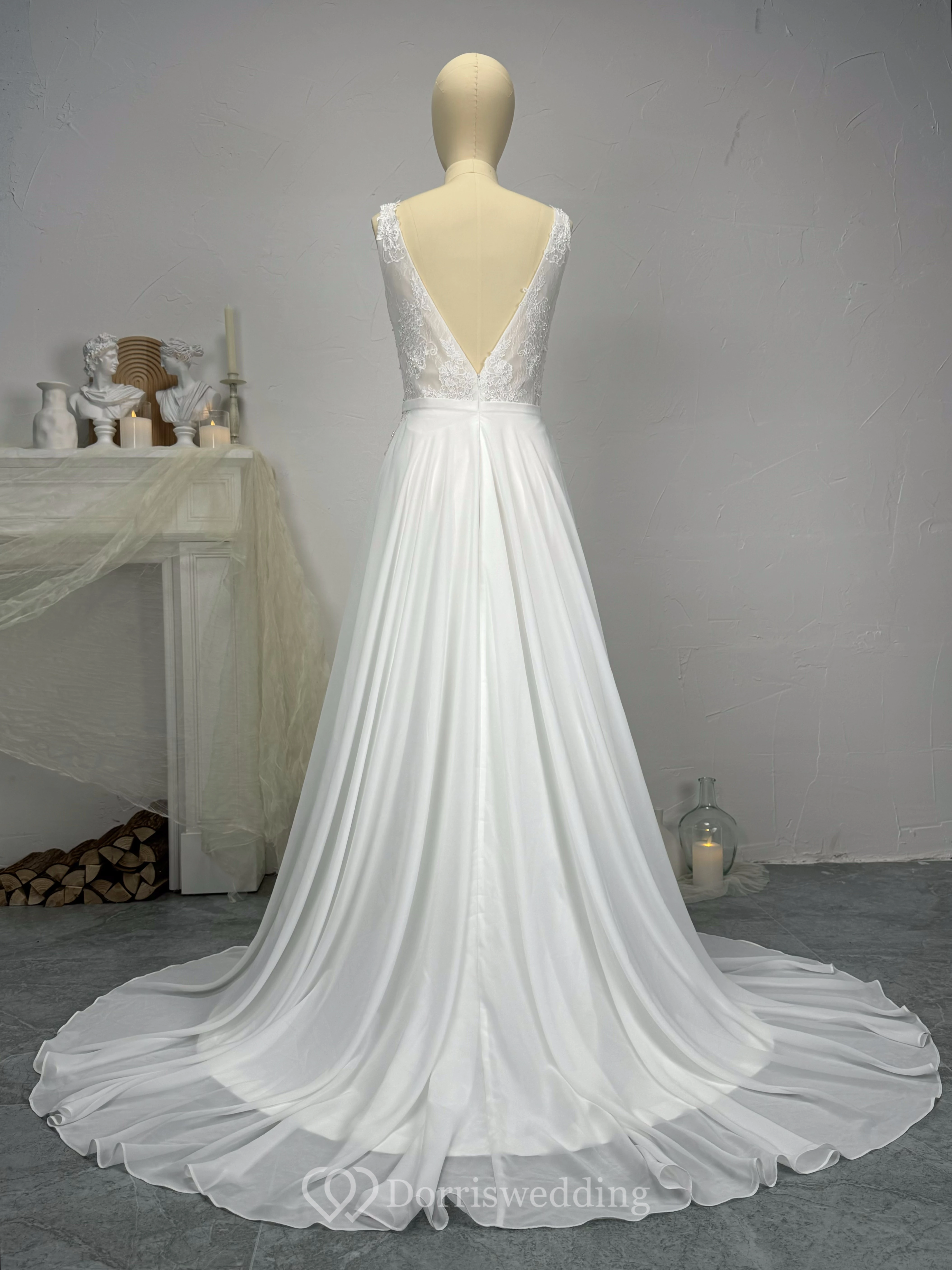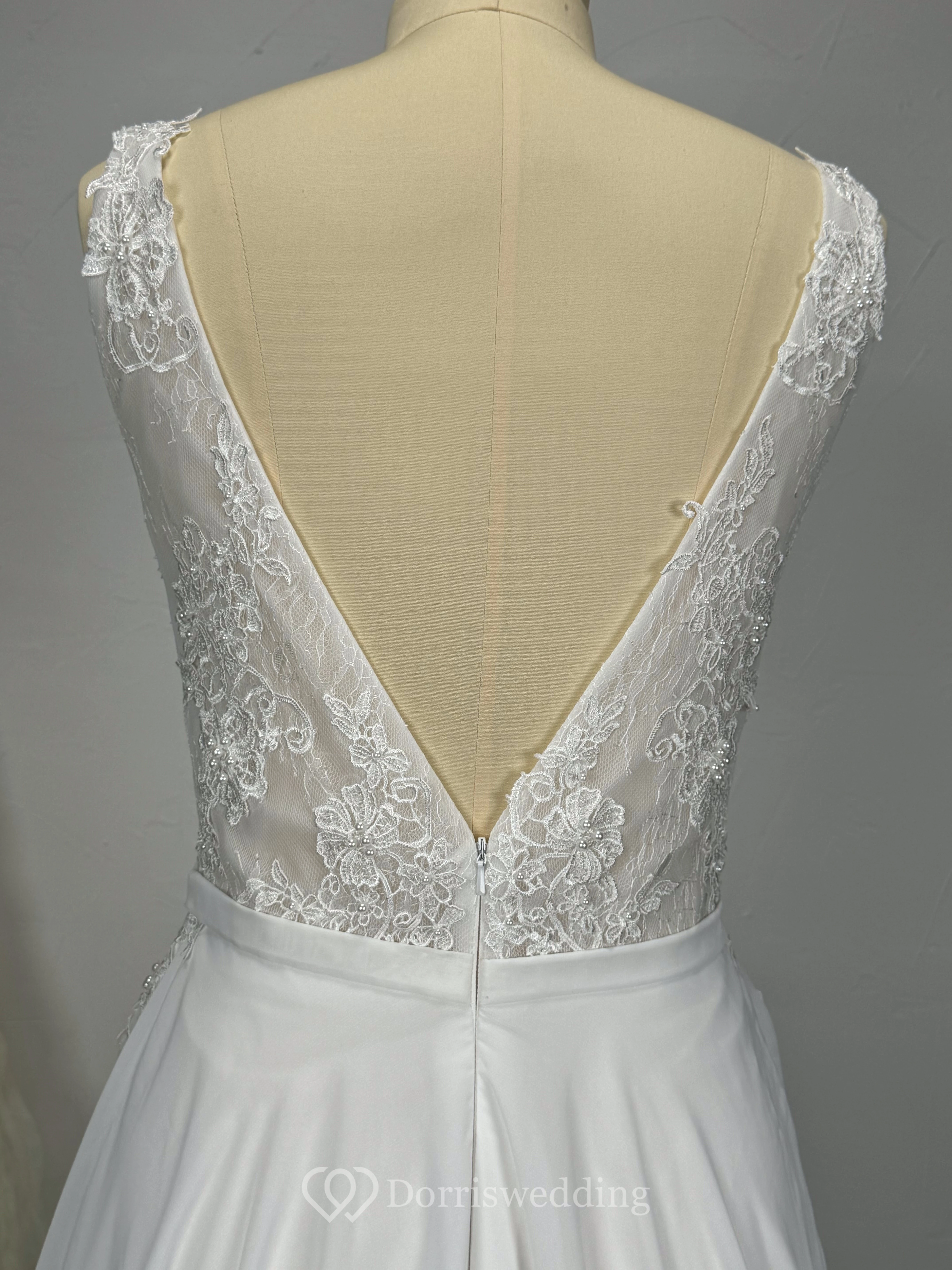 Boho Chiffon Lace A Line Sleeveless Low-v Back Wedding Dress with Beading