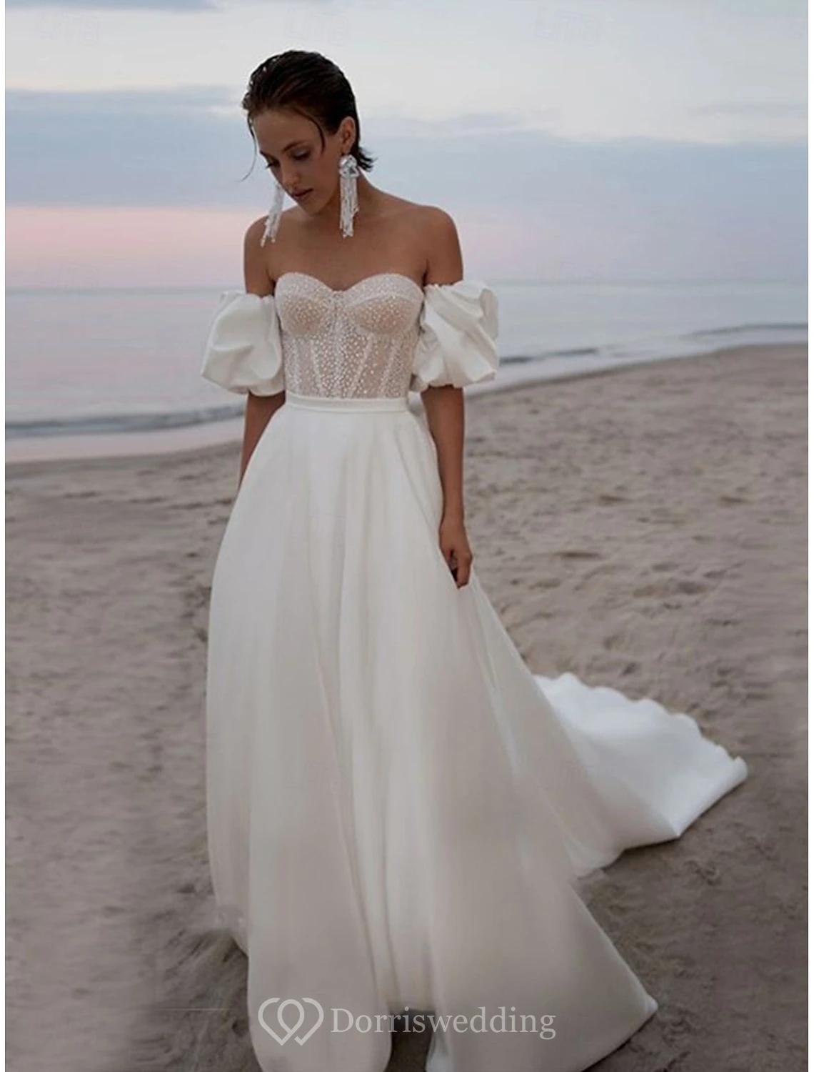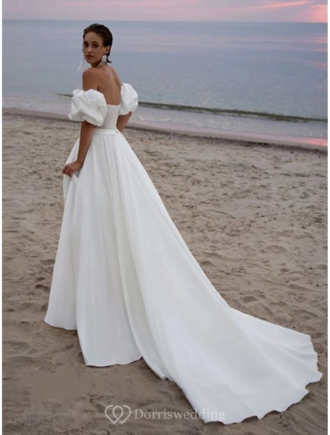 Step into boho-inspired romance with this off-shoulder corset wedding dress, featuring detachable puff sleeves and a softly flowing A-line skirt. The delicate lace bodice and sweetheart neckline highlight your figure, while the lightweight fabric ensures effortless movement. ✨ Features: Off-Shoulder Corset, Detachable Puff Sleeves, A-Line Silhouette, Sweetheart Neckline, Lightweight Fabric. Ideal for outdoor or beach ceremonies.