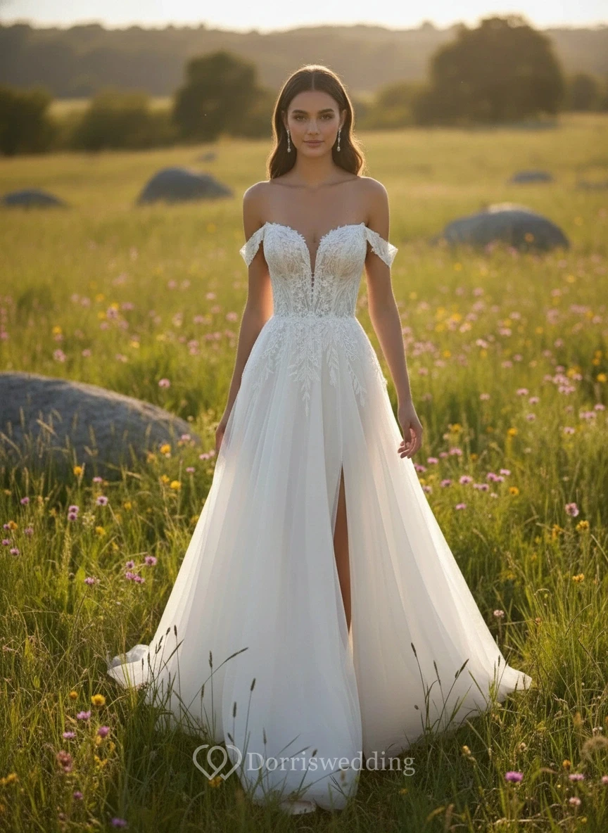 This beautiful garden wedding dress features an off-the-shoulder neckline with lace details and a full skirt with a dramatic slit. Set in a grassy field with pink and yellow flowers against rocky hills, it creates a warm, romantic atmosphere for an outdoor garden or country wedding.