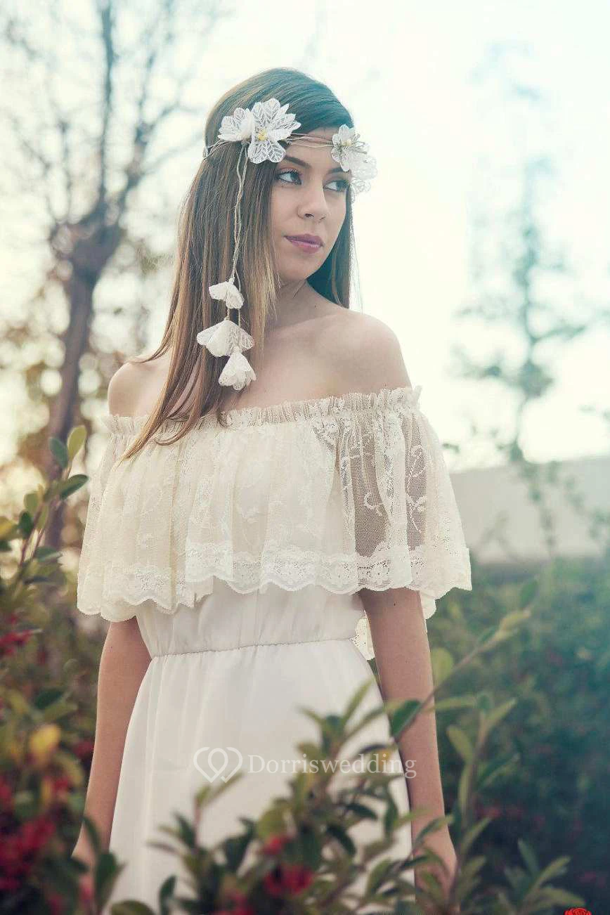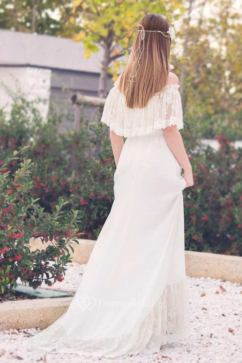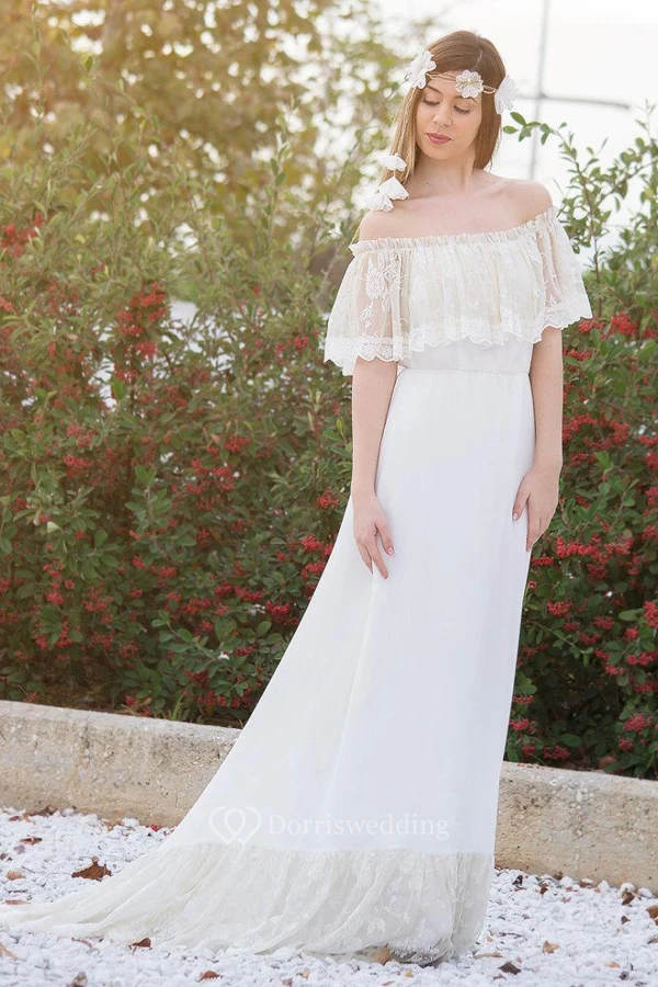 Boho Off-The-Shoulder Lace Chiffon Simple Wedding Dress With Sweep Train