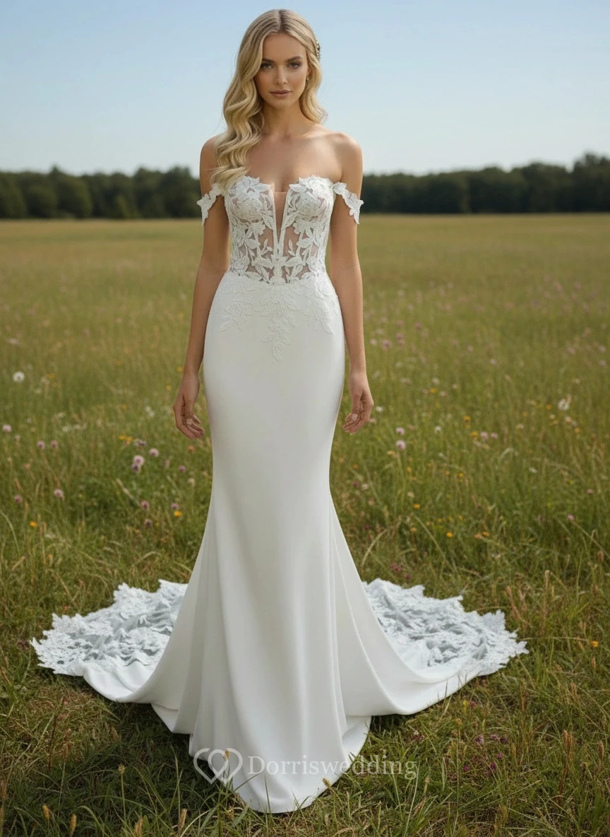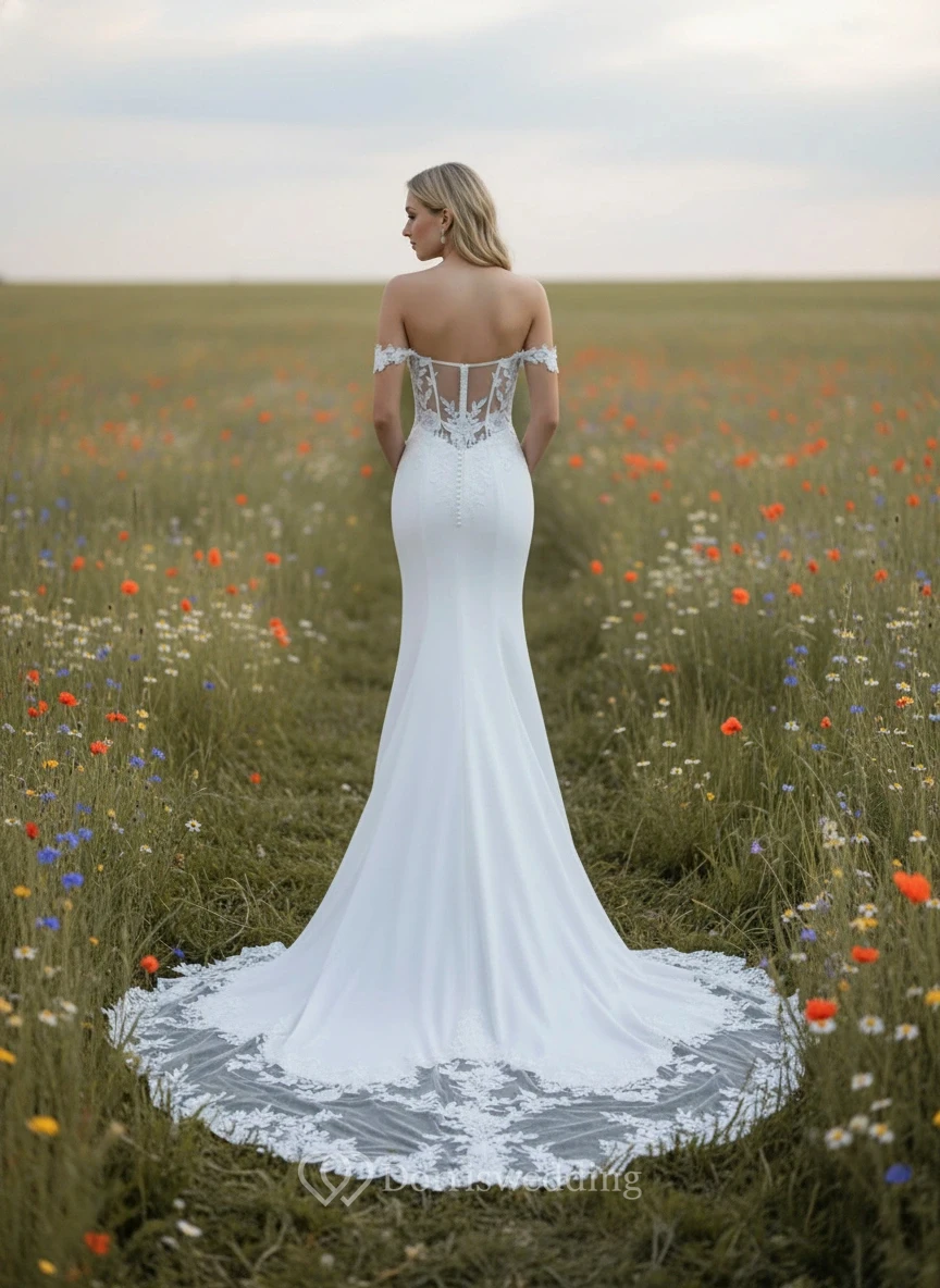 This elegant mermaid wedding dress features an off-the-shoulder neckline with lace bodice and a sleek satin skirt with lace-trimmed train. Set in a vibrant green field with flowers against blue skies, it creates a romantic silhouette for an outdoor garden wedding.