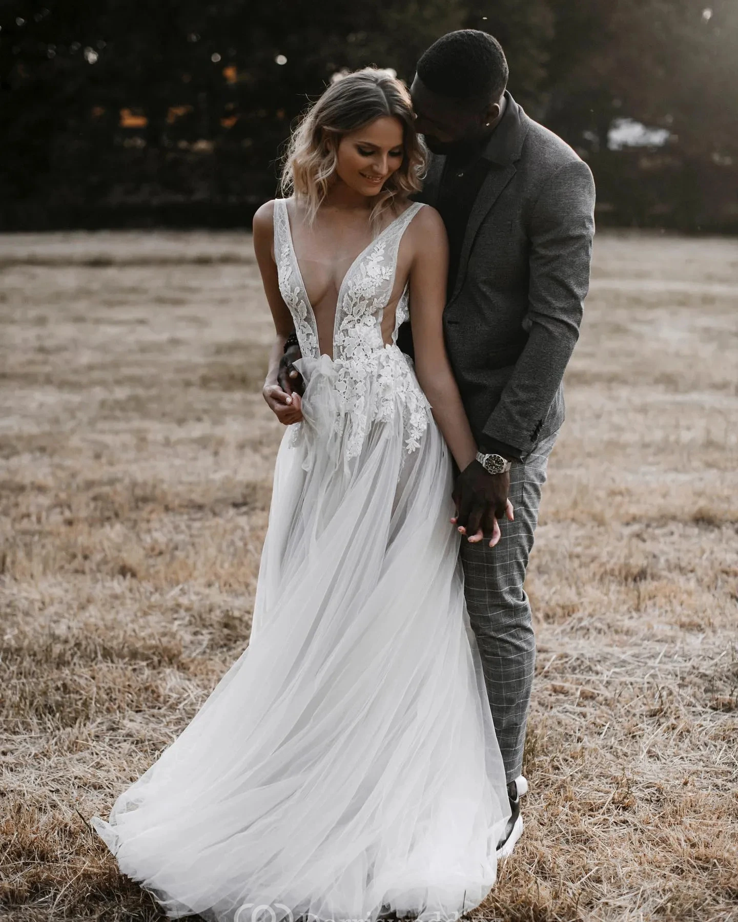 Boho Tulle Wedding Dress with Plunging Illusion Neckline