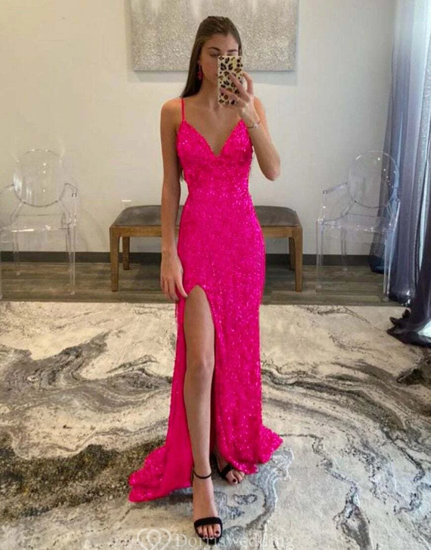 Bold Fuchsia Sequin Gown with Spaghetti Straps & Thigh-High Slit
