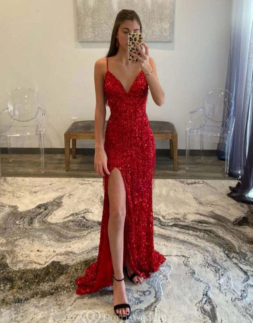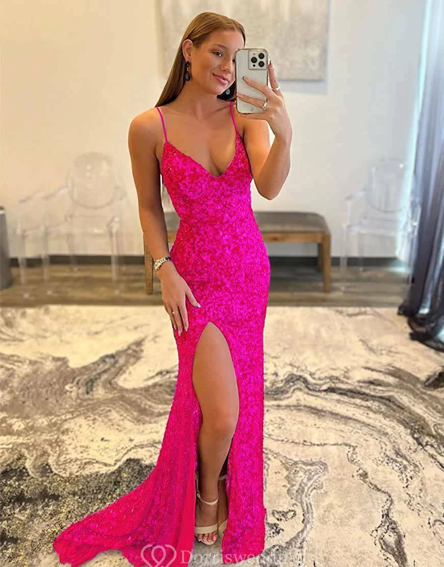 Turn heads in this bold fuchsia sequin gown, complete with spaghetti straps and a thigh-high slit. The curve-hugging silhouette and open back create a striking look for proms, pageants, or any show-stopping occasion. ✨ Features: Fuchsia Sequins, Spaghetti Straps, Thigh-High Slit, Fitted Silhouette, Open Back.