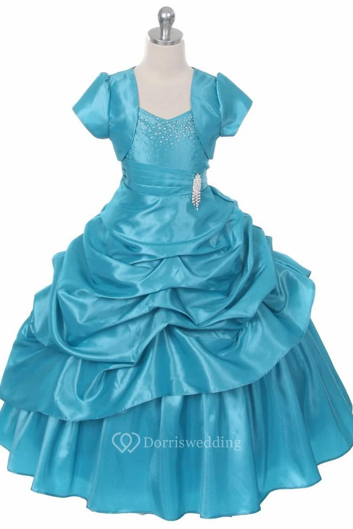 Bolero Ankle-Length Beaded Pleated Lace&Taffeta Flower Girl Dress