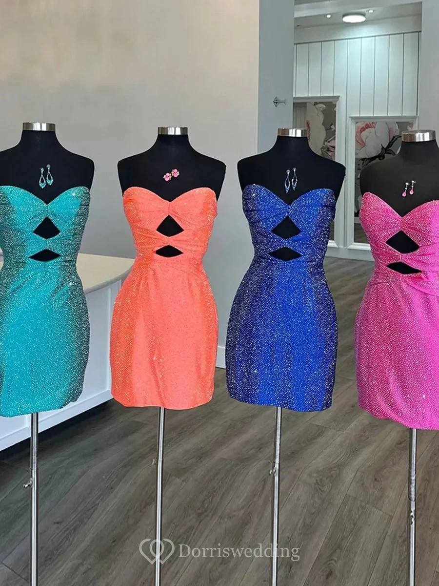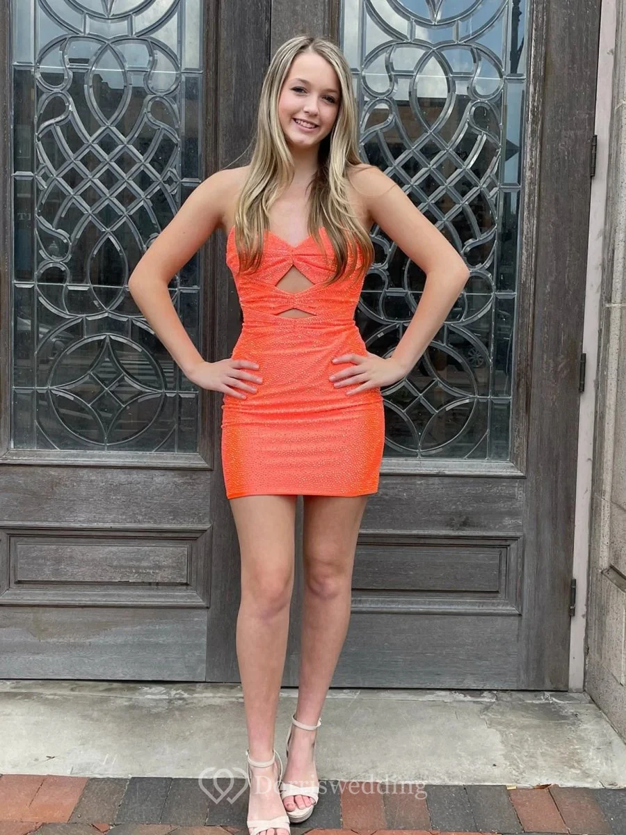 This eye-catching bright orange strapless dress features cut-out details at the chest, a fitted waist, and a short skirt covered in sequins or rhinestones for a sparkling effect. The design is modern and sexy, perfect for making a statement at parties or events. The lightweight fabric allows for easy movement, while the sequins add luxury. Ideal for cocktails, proms, or evening gatherings, it embodies confidence and style.