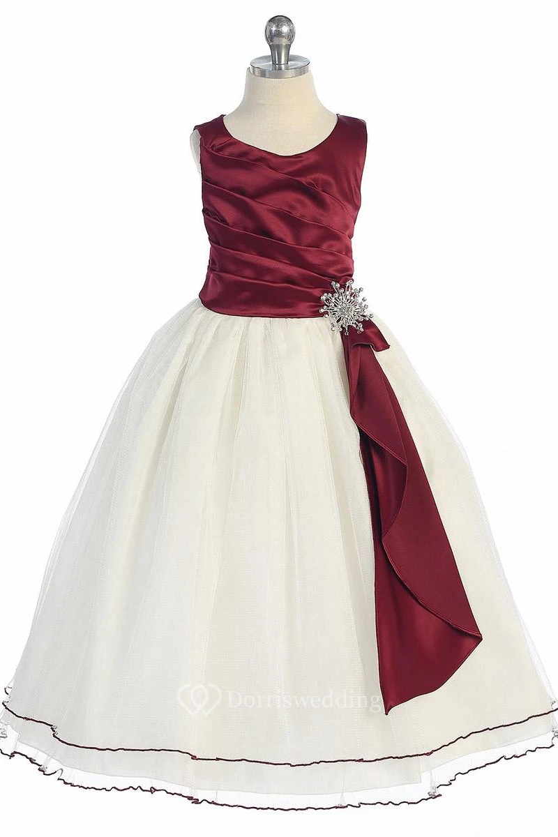 Broach Tea-Length Pleated Satin Flower Girl Dress With Ruffles