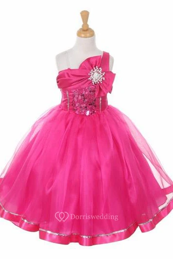 Broach Tea-Length Tiered Bowed Sequins&Organza Flower Girl Dress With Sash