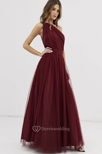 Burgundy Tulle One Shoulder And Open Back Bridesmaid Dress With Ruching