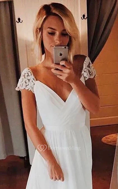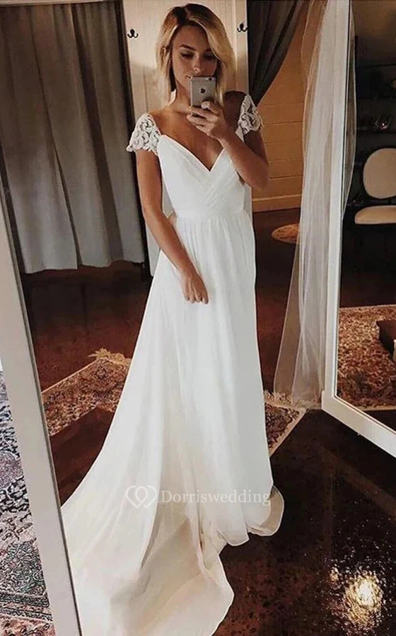 Cap Criss-cross Chiffon Empire Ruched Court Train Wedding Dress