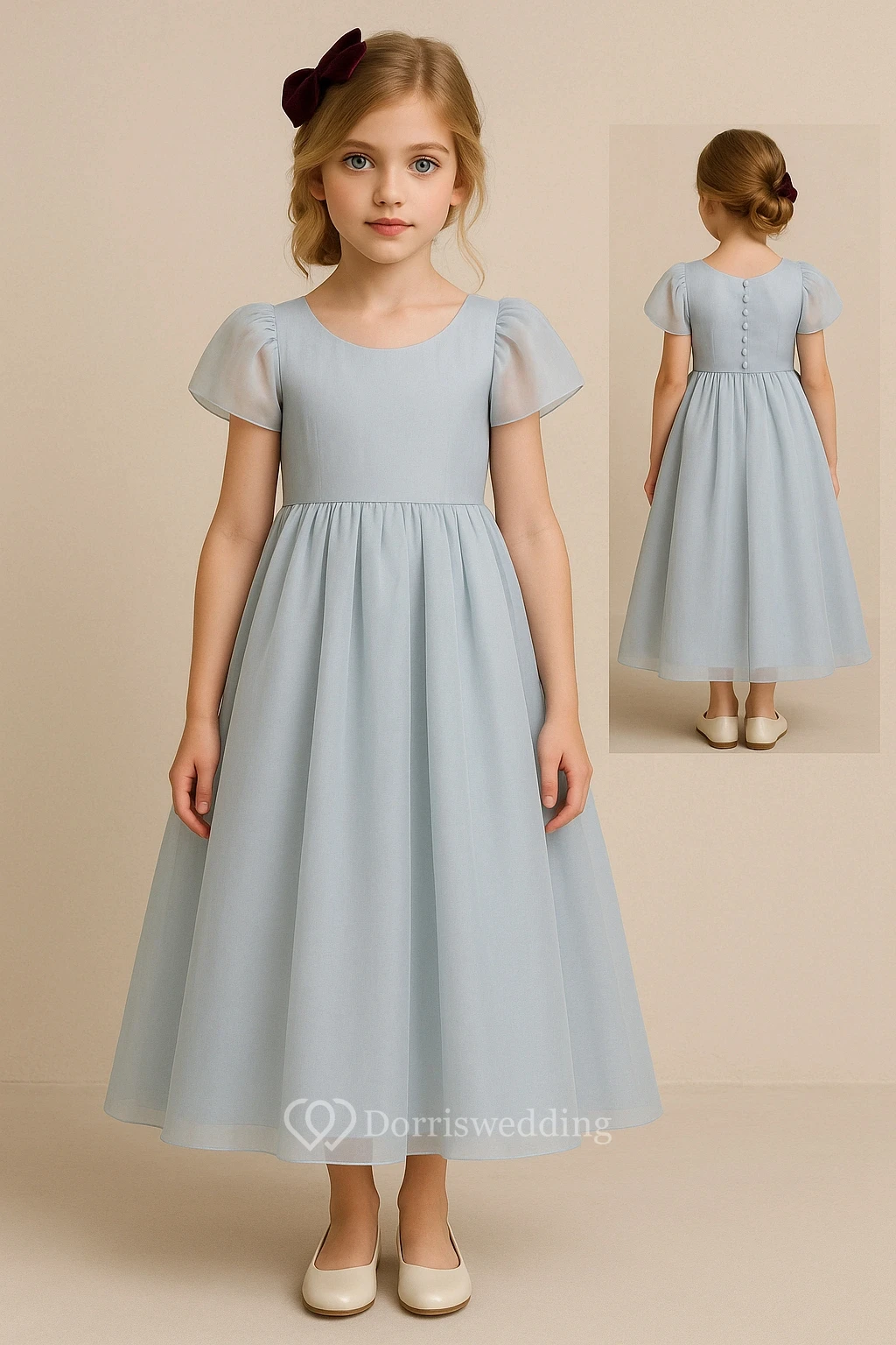 Cap Scoop-neck Satin A-line Tea-length Flowergirl Dress
