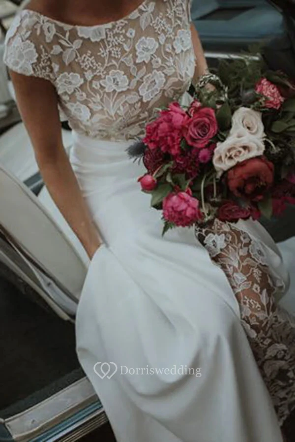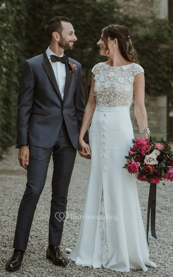 Cap Sheath Mermaid Applique Front Split Simple Wedding Dress with Lace Top