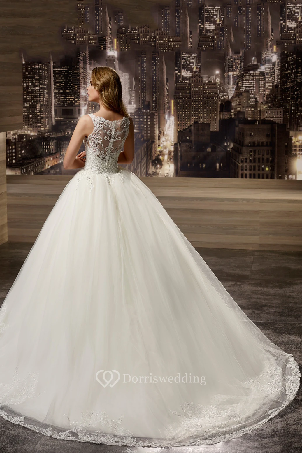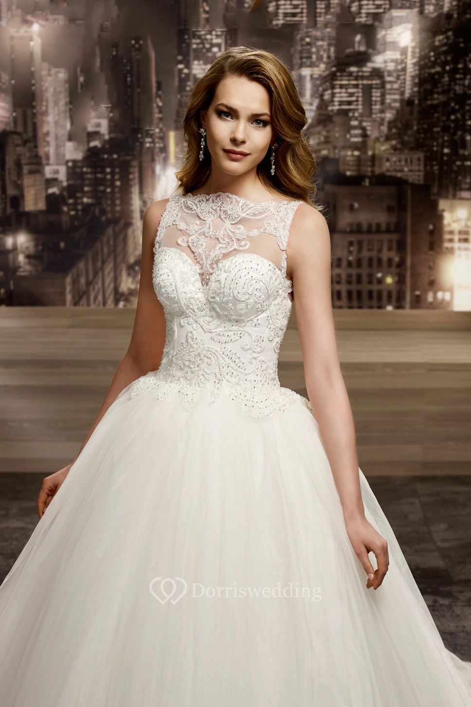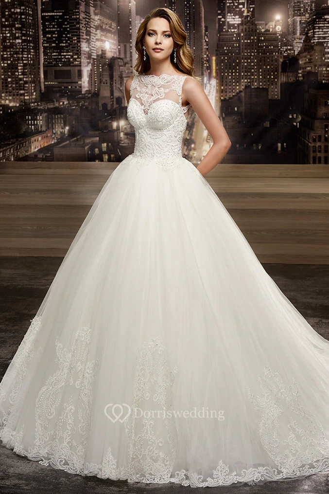 Cap Sleeve A-Line Jewel-Neck Bridal Gown With Lace Corset And Brush Train