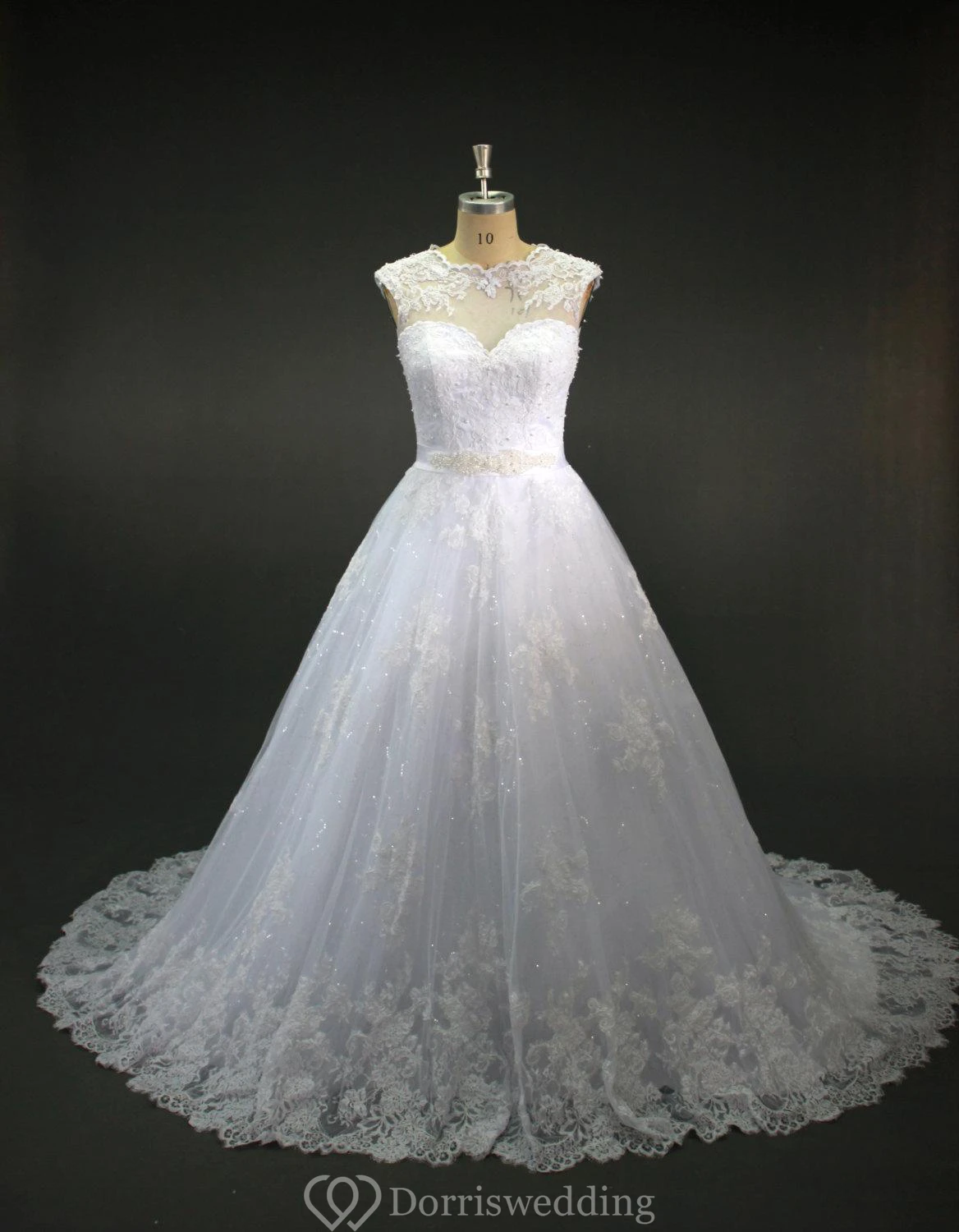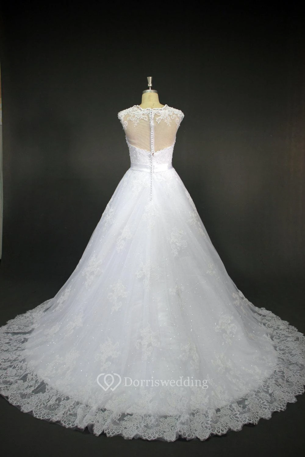 Cap Sleeve A-Line Lace Dress With Jewel Neck and Illusion Back