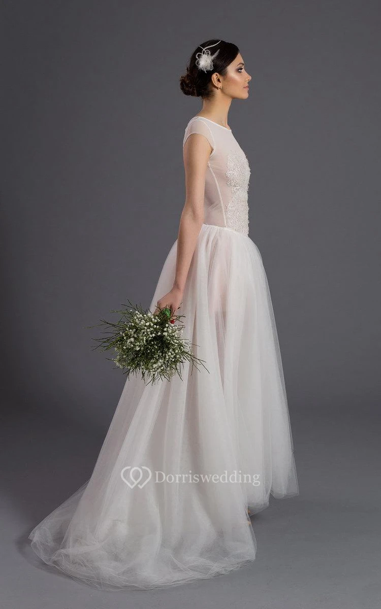 Cap Sleeve A-Line Tulle Gown With Illusion Back and Scoop Neckline